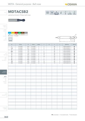 MDTA - General purpose - Ball nose INFO MDTACSB2 OSAWA <45NORMHRC cylindrical shank, 2 flutes ball nose CARBIDE DRILLS PU-HPU TA-4HTA SUH P M K N S H ALH HRC H I H I R SUH MINI H 1st choice I suitable HL HSD C-SD-TA COPYING D D Tol. R R Tol. d(h6) l l1 L z EDP No. Stock 1 0/-0.030 0.50 0/-0.020 3 3 40 2 MDTACSB2010 h 1.5 0/-0.030 0.75 0/-0.020 3 5 40 2 MDTACSB2015 h 2 0/-0.030 1.00 0/-0.020 3 7 40 2 MDTACSB2020 h 2.5 0/-0.030 1.25 0/-0.020 3 8 40 2 MDTACSB2025 h 3 0/-0.030 1.50 0/-0.020 3 10 40 2 MDTACSB2030 h HSS DRILLS 4 0/-0.030 2.00 0/-0.020 4 12 40 2 MDTACSB2040 h 5 0/-0.030 2.50 0/-0.020 5 14 50 2 MDTACSB2050 h LFTA 6 0/-0.030 3.00 0/-0.020 6 7 50 2 MDTACSB2060 h SUTAHSS-HSS/CO 8 0/-0.030 4.00 0/-0.020 8 9 60 2 MDTACSB2080 h 10 0/-0.030 5.00 0/-0.020 10 10 60 2 MDTACSB2100 h 12 0/-0.030 6.00 0/-0.020 12 14 70 2 MDTACSB2120 h CARBIDE END-MILLS G2 MDTA HF VH/UP MEF ALU MEX/MH UH/MH HSS END-MILLS CARBIDE BURRS h stock standard f non-standard stock m stock exhaustion 362