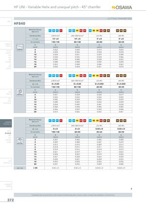 HF UNI - Variable Helix and unequal pitch - 45° chamfer CUTTING PARAMETERS INFO HF840 Material GroupISO 513 P1 P2 P7 K1 P3 P4 M1 K2 K3 P5 M2 M3 K4 S1 S4 S2 S3 S5 Hardness/Rm ≤700 N/mm² 600÷1000 N/mm² ≤35 HRC ≤40 HRC ° x ae 15° x D 10° x D 5° x D 5° x D Vc (m/min) 130÷150 80÷100 60÷80 30÷50 CARBIDEDRILLS D fz fz fz fz(mm)(mm/z)(mm/z)(mm/z)(mm/z) RAMPING 6 0.022 0.020 0.019 0.026 PU-HPU TA-4HTA 8 0.028 0.026 0.024 0.034 SUH 10 0.034 0.031 0.029 0.040 ALH 12 0.038 0.035 0.034 0.046 HRC 14 0.043 0.040 0.038 0.052 SUH MINI 16 0.048 0.044 0.042 0.058 HL 18 0.053 0.048 0.046 0.063 HSD 20 0.058 0.054 0.051 0.070 C-SD-TA Material Group P1 P2 P7 K1 P3 P4 M1 K2 K3 P5 M2 M3 K4 S1 S4 S2 S3 S5 ISO 513 Hardness/Rm ≤700 N/mm² 600÷1000 N/mm² ≤35 HRC ≤40 HRC ap x ae D x 0.4D D x 0.4D D x 0.25D D x 0.25D Vc (m/min) 130÷150 80÷100 60÷80 30÷50 D fz fz fz fz HSS (mm) (mm/z) (mm/z) (mm/z) (mm/z) DRILLS VERTICAL 6 0.027 0.024 0.020 0.019 8 0.035 0.032 0.026 0.025 LFTA 10 0.042 0.038 0.032 0.029 SUTAHSS-HSS/CO 12 0.048 0.043 0.036 0.034 14 0.054 0.049 0.041 0.038 16 0.060 0.054 0.045 0.042 18 0.066 0.059 0.050 0.046 20 0.073 0.066 0.055 0.051 Material Group P1 P2 P7 K1 P3 P4 M1 K2 K3 P5 M2 M3 K4 S1 S4 S2 S3 S5 CARBIDE ISO 513 END-MILLS Hardness/Rm ≤700 N/mm² 600÷1000 N/mm² ≤35 HRC ≤40 HRC G2 ap x ae DxD DxD 0.5D x D 0.5D x D MDTA Vc (m/min) 100÷120 60÷80 45÷65 20÷40 HF VH/UP MEF D fz fz fz fz ALU (mm) (mm/z) (mm/z) (mm/z) (mm/z) MEX/MH 3 0.007 0.006 0.006 0.008 UH/MH 4 0.009 0.008 0.007 0.010 DRILLING 5 0.012 0.010 0.009 0.013 6 0.014 0.012 0.011 0.015 8 0.018 0.016 0.014 0.019 10 0.021 0.019 0.017 0.023 12 0.024 0.022 0.019 0.026 14 0.027 0.024 0.022 0.030 16 0.030 0.027 0.024 0.033 HSS 18 0.033 0.030 0.026 0.036 END-MILLS 20 0.037 0.033 0.029 0.040 ap x ae ≤ D5 0.5D x D 0.5D x D 0.25D x D 0.25D x D CARBIDE BURRS PARAMETERS SUGGESTED WITH HIGH POWER MILLING CHUCK AND STABLE MACHINING CONDITION 372