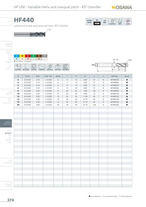 HF UNI - Variable Helix and unequal pitch - 45° chamfer INFO HF440 OSAWANORM cylindrical shank and reduced neck, 45° chamfer C45° CARBIDE DRILLS PU-HPU TA-4HTA SUH P M K N S H ALH HRC H H H H C45° SUH MINI H 1st choice I suitable HL HSD 1.5D C-SD-TA SLOTTING SIDE MILLING HELICAL RAMPING VERTICAL DRILLING TROCHOIDAL D D Tol. C45° C45° Tol. d(h6) l l1 d1 L z EDP No. Stock 3 0/-0.030 0.10 +/-0.020 6 9 15 2.80 57 4 HF440030 h 4 0/-0.030 0.10 +/-0.020 6 11 18 3.80 57 4 HF440040 h 5 0/-0.030 0.10 +/-0.020 6 13 19 4.80 57 4 HF440050 h 6 0/-0.030 0.10 +/-0.020 6 13 20 5.80 57 4 HF440060 h 8 0/-0.030 0.20 +/-0.020 8 20 26 7.80 64 4 HF440080 h HSS DRILLS 10 0/-0.030 0.20 +/-0.020 10 22 30 9.80 72 4 HF440100 h 12 0/-0.030 0.20 +/-0.020 12 26 36 11.80 83 4 HF440120 h LFTA 14 0/-0.030 0.20 +/-0.020 14 26 36 13.70 83 4 HF440140 h SUTAHSS-HSS/CO 16 0/-0.030 0.30 +/-0.020 16 32 42 15.70 92 4 HF440160 h 20 0/-0.030 0.40 +/-0.020 20 38 50 19.70 104 4 HF440200 h CARBIDE END-MILLS G2 MDTA HF VH/UP MEF ALU MEX/MH UH/MH HSS END-MILLS CARBIDE BURRS h stock standard f non-standard stock m stock exhaustion 374