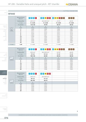 HF UNI - Variable Helix and unequal pitch - 45° chamfer CUTTING PARAMETERS INFO HF440 Material GroupISO 513 P1 P2 P7 K1 P3 P4 M1 K2 K3 P5 M2 M3 K4 S1 S4 S2 S3 S5 Hardness/Rm ≤700 N/mm² 600÷1000 N/mm² ≤35 HRC ≤40 HRC ° x ae 5° x 0.4D 5° x 0.4D 3° x 0.4D 3° x 0.4D Vc (m/min) 110÷130 70÷90 50÷70 30÷50 CARBIDEDRILLS D fz fz fz fz(mm)(mm/z)(mm/z)(mm/z)(mm/z) 3 0.009 0.009 0.008 0.007 PU-HPU TA-4HTA HELICAL 4 0.012 0.011 0.010 0.009 SUH 5 0.015 0.014 0.012 0.012 ALH 6 0.018 0.016 0.015 0.014 HRC 8 0.023 0.021 0.019 0.018 SUH MINI 10 0.028 0.026 0.023 0.021 HL 12 0.031 0.029 0.026 0.024 HSD 14 0.035 0.033 0.029 0.027 C-SD-TA 16 0.039 0.037 0.032 0.030 20 0.048 0.045 0.039 0.037 ° x ae ≤ D5 2° x 0.4D 2° x 0.4D 1° x 0.4D 1° x 0.4D Material Group P1 P2 P7 K1 P3 P4 M1 K2 K3 P5 M2 M3 K4 S1 S4 S2 S3 S5 ISO 513 Hardness/Rm ≤700 N/mm² 600÷1000 N/mm² ≤35 HRC ≤40 HRC HSS ° x ae 15° x D 10° x D 5° x D 5° x D DRILLS Vc (m/min) 100÷120 60÷80 45÷65 30÷40 LFTA D fz fz fz fz SUTA RAMPINGHSS-HSS/CO (mm)6 (mm/z)0.019 (mm/z)0.018 (mm/z)0.017 (mm/z)0.023 8 0.025 0.023 0.022 0.030 10 0.030 0.028 0.026 0.036 12 0.034 0.032 0.030 0.042 14 0.039 0.036 0.034 0.047 16 0.043 0.040 0.038 0.052 20 0.052 0.048 0.046 0.063 CARBIDE END-MILLS Material GroupISO 513 P1 P2 P7 K1 P3 P4 M1 K2 K3 G2 MDTA Hardness/Rm ≤700 N/mm² 600÷1000 N/mm² HF VH/UP ° x ae 30° x D 15° x D MEF Vc (m/min) 80÷100 50÷70 ALU MEX/MH RAMPINGUH/MH D(mm) fz(mm/z) fz(mm/z) 10 0.025 0.023 12 0.028 0.026 14 0.032 0.029 16 0.035 0.032 20 0.043 0.039 HSS END-MILLS CARBIDE BURRS PARAMETERS SUGGESTED WITH HIGH POWER MILLING CHUCK AND STABLE MACHINING CONDITION 376