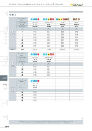 HF UNI - Variable Helix and unequal pitch - 45° chamfer CUTTING PARAMETERS INFO HF441 Material GroupISO 513 P1 P2 P7 K1 P3 P4 M1 K2 K3 P5 M2 M3 K4 S1 S4 S2 S3 S5 Hardness/Rm ≤700 N/mm² 600÷1000 N/mm² ≤35 HRC ≤40 HRC ap x ae DxD DxD 0.5D x D 0.5D x D Vc (m/min) 110÷130 70÷90 50÷70 30÷50 CARBIDEDRILLS D fz fz fz fz(mm)(mm/z)(mm/z)(mm/z)(mm/z) 3 0.013 0.011 0.009 0.009 PU-HPU TA-4HTA SLOTTINGSUH 45 0.0170.021 0.0150.019 0.0120.016 0.0120.014 ALH 6 0.024 0.022 0.018 0.017 HRC 8 0.032 0.028 0.024 0.022 SUH MINI 10 0.038 0.034 0.028 0.026 HL 12 0.043 0.039 0.032 0.030 HSD 14 0.049 0.044 0.036 0.034 C-SD-TA 16 0.054 0.049 0.041 0.038 18 0.059 0.053 0.045 0.042 20 0.066 0.059 0.049 0.046 ap x ae ≤ D5 0.5D x D 0.5D x D 0.25D x D 0.25D x D Material Group P1 P2 P7 K1 P3 P4 M1 K2 K3 ISO 513 HSS Hardness/Rm ≤700 N/mm² 600÷1000 N/mm² DRILLS ap x ae 1.5D x D 1.5D x D Vc (m/min) 85÷105 55÷75 LFTA SUTA D fz fz HSS-HSS/CO SLOTTING (mm)8 (mm/z)0.025 (mm/z)0.023 10 0.030 0.027 12 0.035 0.031 14 0.039 0.035 16 0.043 0.039 18 0.048 0.043 20 0.053 0.047 CARBIDE END-MILLS G2 Material GroupISO 513 P1 P2 P7 K1 MDTA HF VH/UP Hardness/Rm ≤700 N/mm² MEF ap x ae 2D x D ALU MEX/MH Vc (m/min) 60÷80 UH/MH D fz SLOTTING (mm) (mm/z) 10 0.023 12 0.026 14 0.029 16 0.032 18 0.036 20 0.039 HSS END-MILLS CARBIDE BURRS PARAMETERS SUGGESTED WITH HIGH PRECISION WELDON CHUCK AND STABLE MACHINING CONDITION. FOR APPLICATION ON HIGH POWER MILLING CHUCK, PLEASE REFER TO HF440 PARAMETERS. 380