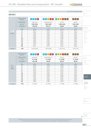 HF UNI - Variable Helix and unequal pitch - 45° chamfer CUTTING PARAMETERS INFO HF441 Material GroupISO 513 P1 P2 P7 K1 P3 P4 M1 K2 K3 P5 M2 M3 K4 S1 S4 S2 S3 S5 Hardness/Rm ≤700 N/mm² 600÷1000 N/mm² ≤35 HRC ≤40 HRC ap x ae 1.5D x 0.5D 1.5D x 0.5D 1.2D x 0.3D 1.2D x 0.3D Vc (m/min) 130÷150 90÷110 60÷80 40÷60 D fz(mm)(mm/z) fz(mm/z) fz(mm/z) fz(mm/z) CARBIDEDRILLS 3 0.015 0.014 0.012 0.017 PU-HPU 4SIDE MILLING5 0.0200.025 0.0180.022 0.0160.020 0.022 TA-4HTA0.027SUH 6 0.029 0.026 0.023 0.032 ALH 8 0.038 0.034 0.030 0.042 HRC 10 0.045 0.041 0.036 0.050 SUH MINI 12 0.052 0.047 0.041 0.057 HL 14 0.058 0.052 0.047 0.064 HSD 16 0.065 0.058 0.052 0.071 C-SD-TA 18 0.071 0.064 0.057 0.078 20 0.079 0.071 0.063 0.087 ap x ae ≤ D5 1.5D x 0.25D 1.5D x 0.25D 1.2D x 0.1D 1.2D x 0.1D Material Group P1 P2 P7 K1 P3 P4 M1 K2 K3 P5 M2 M3 K4 S1 S4 S2 S3 S5 ISO 513 Hardness/Rm ≤700 N/mm² 600÷1000 N/mm² ≤35 HRC ≤40 HRC HSS DRILLS ° x ae 5° x 0.4D 4° x 0.4D 3° x 0.4D 3° x 0.4D Vc (m/min) 110÷130 70÷90 50÷70 30÷50 LFTA D fz fz fz fz SUTA (mm) (mm/z) (mm/z) (mm/z) (mm/z) HSS-HSS/CO 3 0.009 0.009 0.008 0.007 4 0.012 0.011 0.010 0.009 HELICAL 5 0.015 0.014 0.012 0.012 6 0.018 0.016 0.015 0.014 8 0.023 0.021 0.019 0.018 10 0.028 0.026 0.023 0.021 12 0.031 0.029 0.026 0.024 14 0.035 0.033 0.029 0.027 CARBIDEEND-MILLS 16 0.039 0.037 0.032 0.030 18 0.043 0.040 0.036 0.033 G2 20 0.048 0.045 0.039 0.037 MDTA ° x ae ≤ D5 2° x 0.4D 2° x 0.4D 1° x 0.4D 1° x 0.4D HF VH/UPMEF ALU MEX/MH UH/MH HSS END-MILLS CARBIDE BURRS PARAMETERS SUGGESTED WITH HIGH PRECISION WELDON CHUCK AND STABLE MACHINING CONDITION. FOR APPLICATION ON HIGH POWER MILLING CHUCK, PLEASE REFER TO HF440 PARAMETERS. 381