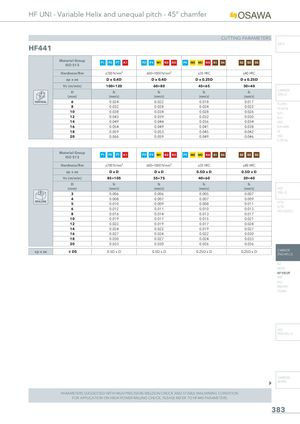 HF UNI - Variable Helix and unequal pitch - 45° chamfer CUTTING PARAMETERS INFO HF441 Material GroupISO 513 P1 P2 P7 K1 P3 P4 M1 K2 K3 P5 M2 M3 K4 S1 S4 S2 S3 S5 Hardness/Rm ≤700 N/mm² 600÷1000 N/mm² ≤35 HRC ≤40 HRC ap x ae D x 0.4D D x 0.4D D x 0.25D D x 0.25D Vc (m/min) 100÷120 60÷80 45÷65 30÷40 D fz(mm)(mm/z) fz(mm/z) fz(mm/z) fz(mm/z) CARBIDEDRILLS VERTICAL 6 0.024 0.022 0.018 0.017 PU-HPU 8 0.032 0.028 0.024 0.022 TA-4HTA 10 0.038 0.034 0.028 0.026 SUH 12 0.043 0.039 0.032 0.030 ALH 14 0.049 0.044 0.036 0.034 HRC 16 0.054 0.049 0.041 0.038 SUH MINI 18 0.059 0.053 0.045 0.042 HL 20 0.066 0.059 0.049 0.046 HSD C-SD-TA Material Group P1 P2 P7 K1 P3 P4 M1 K2 K3 P5 M2 M3 K4 S1 S4 S2 S3 S5 ISO 513 Hardness/Rm ≤700 N/mm² 600÷1000 N/mm² ≤35 HRC ≤40 HRC ap x ae DxD DxD 0.5D x D 0.5D x D Vc (m/min) 85÷105 55÷75 40÷60 20÷40 D fz fz fz fz (mm) (mm/z) (mm/z) (mm/z) (mm/z) HSS 3 0.006 0.006 0.005 0.007 DRILLS 4 0.008 0.007 0.007 0.009 DRILLING 5 0.010 0.009 0.008 0.011 LFTA 6 0.012 0.011 0.010 0.013 SUTAHSS-HSS/CO 8 0.016 0.014 0.013 0.017 10 0.019 0.017 0.015 0.021 12 0.022 0.019 0.017 0.024 14 0.024 0.022 0.019 0.027 16 0.027 0.024 0.022 0.030 18 0.030 0.027 0.024 0.033 20 0.033 0.030 0.026 0.036 ap x ae ≤ D5 0.5D x D 0.5D x D 0.25D x D 0.25D x D CARBIDE END-MILLS G2 MDTA HF VH/UP MEF ALU MEX/MH UH/MH HSS END-MILLS CARBIDE BURRS PARAMETERS SUGGESTED WITH HIGH PRECISION WELDON CHUCK AND STABLE MACHINING CONDITION. FOR APPLICATION ON HIGH POWER MILLING CHUCK, PLEASE REFER TO HF440 PARAMETERS. 383