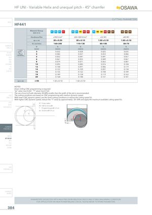 HF UNI - Variable Helix and unequal pitch - 45° chamfer CUTTING PARAMETERS INFO HF441 Material GroupISO 513 P1 P2 P7 K1 P3 P4 M1 K2 K3 P5 M2 M3 K4 S1 S4 S2 S3 S5 Hardness/Rm ≤700 N/mm² 600÷1000 N/mm² ≤35 HRC ≤40 HRC ap x ae 2D x 0.2D 2D x 0.1D 1.5D x 0.1D 1.5D x 0.1D Vc (m/min) 160÷200 110÷130 80÷100 50÷70 CARBIDEDRILLS D fz fz fz fz(mm)(mm/z)(mm/z)(mm/z)(mm/z) 3 0.032 0.028 0.025 0.035 PU-HPU TA-4HTA TROCHOIDALSUH 45 0.0420.052 0.0370.047 0.0330.041 0.0460.057 ALH 6 0.061 0.055 0.049 0.067 HRC 8 0.079 0.071 0.063 0.087 SUH MINI 10 0.095 0.085 0.076 0.104 HL 12 0.108 0.097 0.086 0.119 HSD 14 0.122 0.109 0.097 0.134 C-SD-TA 16 0.135 0.122 0.108 0.149 18 0.149 0.134 0.119 0.163 20 0.164 0.148 0.131 0.181 ap x ae ≤ D5 1.5D x 0.1D 1.5D x 0.1D NOTES: Down milling CNC programming is required. “ae” value max 0.2xD - “T” value max 0.1xD. The use of end mill with diameter 30-40% smaller than the width of the slot is recommended. HSS The cutting conditions are based on CNC programming with medium dynamic speed. DRILLS With lower CNC dynamic speed, use the same cutting conditions or reduce the cutting speed Vc. With higher CNC dynamic speed, reduce the “T” value by approximately -30 -50% and apply the maximum available cutting speed Vc. LFTASUTA ae R1 Cutter radiusR2Half of slot width HSS-HSS/CO T Programming width of cut ae Actual width of cut Y (+) Y X (+) CARBIDE END-MILLS T G2 MDTA HF VH/UP MEF ALU MEX/MH UH/MH HSS END-MILLS CARBIDE BURRS PARAMETERS SUGGESTED WITH HIGH PRECISION WELDON CHUCK AND STABLE MACHINING CONDITION. FOR APPLICATION ON HIGH POWER MILLING CHUCK, PLEASE REFER TO HF440 PARAMETERS. 384 R2 R1
