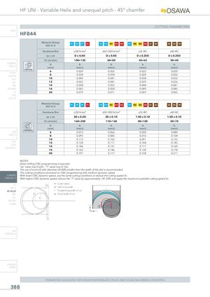 HF UNI - Variable Helix and unequal pitch - 45° chamfer CUTTING PARAMETERS INFO HF844 Material GroupISO 513 P1 P2 P7 K1 P3 P4 M1 K2 K3 P5 M2 M3 K4 S1 S4 S2 S3 S5 Hardness/Rm ≤700 N/mm² 600÷1000 N/mm² ≤35 HRC ≤40 HRC ap x ae D x 0.4D D x 0.4D D x 0.25D D x 0.25D Vc (m/min) 100÷120 60÷80 45÷65 30÷40 CARBIDEDRILLS D fz fz fz fz(mm)(mm/z)(mm/z)(mm/z)(mm/z) VERTICAL 6 0.029 0.026 0.022 0.020 PU-HPU TA-4HTA 8 0.038 0.034 0.028 0.026 SUH 10 0.045 0.041 0.034 0.032 ALH 12 0.052 0.047 0.039 0.036 HRC 14 0.058 0.052 0.044 0.041 SUH MINI 16 0.065 0.058 0.049 0.045 HL 20 0.079 0.071 0.059 0.055 HSD C-SD-TA Material Group P1 P2 P7 K1 P3 P4 M1 K2 K3 P5 M2 M3 K4 S1 S4 S2 S3 S5 ISO 513 Hardness/Rm ≤700 N/mm² 600÷1000 N/mm² ≤35 HRC ≤40 HRC ap x ae 2D x 0.2D 2D x 0.1D 1.5D x 0.1D 1.5D x 0.1D Vc (m/min) 160÷200 110÷130 80÷100 50÷70 D fz fz fz fz (mm) (mm/z) (mm/z) (mm/z) (mm/z) HSS TROCHOIDAL 6 0.073 0.066 0.058 0.080 DRILLS 8 0.095 0.085 0.076 0.104 10 0.113 0.102 0.091 0.125 LFTA 12 0.130 0.117 0.104 0.143 SUTAHSS-HSS/CO 14 0.146 0.131 0.117 0.160 16 0.162 0.146 0.130 0.178 20 0.197 0.177 0.158 0.217 NOTES: Down milling CNC programming is required. “ae” value max 0.2xD - “T” value max 0.1xD. The use of end mill with diameter 30-40% smaller than the width of the slot is recommended. The cutting conditions are based on CNC programming with medium dynamic speed. CARBIDE With lower CNC dynamic speed, use the same cutting conditions or reduce the cutting speed Vc. END-MILLS With higher CNC dynamic speed, reduce the “T” value by approximately -30 -50% and apply the maximum available cutting speed Vc. G2 ae R1 Cutter radius MDTA R2 Half of slot width HF VH/UP T Programming width of cut MEF ae Actual width of cut ALU MEX/MH UH/MH Y (+) Y X (+) T HSS END-MILLS CARBIDE BURRS PARAMETERS SUGGESTED WITH HIGH POWER MILLING CHUCK AND STABLE MACHINING CONDITION 388 R2 R1
