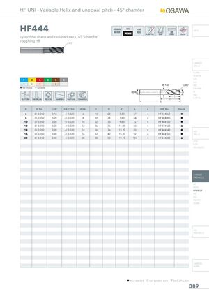 HF UNI - Variable Helix and unequal pitch - 45° chamfer HF444 OSAWANORM INFO cylindrical shank and reduced neck, 45° chamfer, roughing HR C45° CARBIDE DRILLS PU-HPU TA-4HTA P M K N S H SUH ALH H H H H C45° HRC H 1st choice I suitable SUH MINI HL 1.5D HSD SLOTTING SIDE MILLING HELICAL RAMPING VERTICAL TROCHOIDAL C-SD-TA D D Tol. C45° C45° Tol. d(h6) l l1 d1 L z EDP No. Stock 6 0/-0.050 0.10 +/-0.020 6 13 20 5.80 57 4 HF444060 h 8 0/-0.050 0.20 +/-0.020 8 20 26 7.80 64 4 HF444080 h 10 0/-0.050 0.20 +/-0.020 10 22 30 9.80 72 4 HF444100 h 12 0/-0.050 0.20 +/-0.020 12 26 36 11.80 83 4 HF444120 h 14 0/-0.050 0.20 +/-0.020 14 26 36 13.70 83 4 HF444140 h HSS 16 0/-0.050 0.30 +/-0.020 16 32 42 15.70 92 4 HF444160 h DRILLS 20 0/-0.050 0.40 +/-0.020 20 38 50 19.70 104 4 HF444200 h LFTA SUTA HSS-HSS/CO CARBIDE END-MILLS G2 MDTA HF VH/UP MEF ALU MEX/MH UH/MH HSS END-MILLS CARBIDE BURRS h stock standard f non-standard stock m stock exhaustion 389