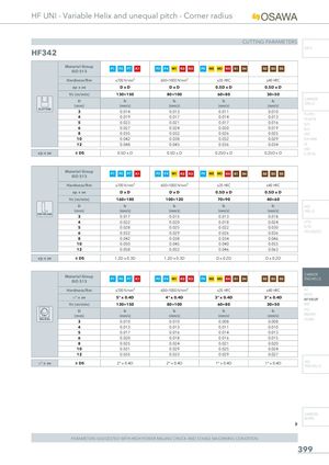 HF UNI - Variable Helix and unequal pitch - Corner radius CUTTING PARAMETERS INFO HF342 Material GroupISO 513 P1 P2 P7 K1 P3 P4 M1 K2 K3 P5 M2 M3 K4 S1 S4 S2 S3 S5 Hardness/Rm ≤700 N/mm² 600÷1000 N/mm² ≤35 HRC ≤40 HRC ap x ae DxD DxD 0.5D x D 0.5D x D Vc (m/min) 130÷150 80÷100 60÷80 30÷50 D fz(mm)(mm/z) fz(mm/z) fz(mm/z) fz(mm/z) CARBIDEDRILLS SLOTTING 3 0.014 0.013 0.011 0.010 PU-HPU 4 0.019 0.017 0.014 0.013 TA-4HTA 5 0.023 0.021 0.017 0.016 SUH 6 0.027 0.024 0.020 0.019 ALH 8 0.035 0.032 0.026 0.025 HRC 10 0.042 0.038 0.032 0.029 SUH MINI 12 0.048 0.043 0.036 0.034 HL HSD ap x ae ≤ D5 0.5D x D 0.5D x D 0.25D x D 0.25D x D C-SD-TA Material GroupISO 513 P1 P2 P7 K1 P3 P4 M1 K2 K3 P5 M2 M3 K4 S1 S4 S2 S3 S5 Hardness/Rm ≤700 N/mm² 600÷1000 N/mm² ≤35 HRC ≤40 HRC ap x ae DxD DxD 0.5D x D 0.5D x D Vc (m/min) 160÷180 100÷120 70÷90 40÷60 D fz fz fz fz HSS (mm) (mm/z) (mm/z) (mm/z) (mm/z) DRILLS SIDE MILLING 3 0.017 0.015 0.013 0.018 4 0.022 0.020 0.018 0.024 LFTA 5 0.028 0.025 0.022 0.030 SUTA 6 0.032 0.029 0.026 0.036 HSS-HSS/CO 8 0.042 0.038 0.034 0.046 10 0.050 0.045 0.040 0.055 12 0.058 0.052 0.046 0.063 ap x ae ≤ D5 1.2D x 0.3D 1.2D x 0.3D D x 0.2D D x 0.2D Material GroupISO 513 P1 P2 P7 K1 P3 P4 M1 K2 K3 P5 M2 M3 K4 S1 S4 S2 S3 S5 CARBIDEEND-MILLS Hardness/Rm ≤700 N/mm² 600÷1000 N/mm² ≤35 HRC ≤40 HRC G2 MDTA ° x ae 5° x 0.4D 4° x 0.4D 3° x 0.4D 3° x 0.4D HF VH/UP Vc (m/min) 130÷150 80÷100 60÷80 30÷50 MEF D fz fz fz fz ALU (mm) (mm/z) (mm/z) (mm/z) (mm/z) MEX/MH HELICAL 3 0.010 0.010 0.008 0.008 UH/MH 4 0.013 0.013 0.011 0.010 5 0.017 0.016 0.014 0.013 6 0.020 0.018 0.016 0.015 8 0.025 0.024 0.021 0.020 10 0.031 0.029 0.025 0.024 12 0.035 0.033 0.029 0.027 ° x ae ≤ D5 2° x 0.4D 2° x 0.4D 1° x 0.4D 1° x 0.4D HSS END-MILLS CARBIDE BURRS PARAMETERS SUGGESTED WITH HIGH POWER MILLING CHUCK AND STABLE MACHINING CONDITION 399