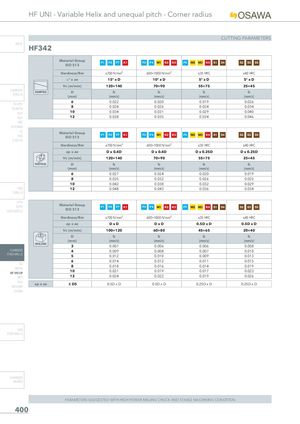 HF UNI - Variable Helix and unequal pitch - Corner radius CUTTING PARAMETERS INFO HF342 Material GroupISO 513 P1 P2 P7 K1 P3 P4 M1 K2 K3 P5 M2 M3 K4 S1 S4 S2 S3 S5 Hardness/Rm ≤700 N/mm² 600÷1000 N/mm² ≤35 HRC ≤40 HRC ° x ae 15° x D 10° x D 5° x D 5° x D Vc (m/min) 120÷140 70÷90 55÷75 25÷45 CARBIDE RAMPINGDRILLS D(mm) fz(mm/z) fz(mm/z) fz(mm/z) fz(mm/z) 6 0.022 0.020 0.019 0.026 PU-HPU TA-4HTA 8 0.028 0.026 0.024 0.034 SUH 10 0.034 0.031 0.029 0.040 ALH 12 0.038 0.035 0.034 0.046 HRC SUH MINI HLHSD Material GroupISO 513 P1 P2 P7 K1 P3 P4 M1 K2 K3 P5 M2 M3 K4 S1 S4 S2 S3 S5 C-SD-TA Hardness/Rm ≤700 N/mm² 600÷1000 N/mm² ≤35 HRC ≤40 HRC ap x ae D x 0.4D D x 0.4D D x 0.25D D x 0.25D Vc (m/min) 120÷140 70÷90 55÷75 25÷45 VERTICAL D fz fz fz fz (mm) (mm/z) (mm/z) (mm/z) (mm/z) 6 0.027 0.024 0.020 0.019 8 0.035 0.032 0.026 0.025 10 0.042 0.038 0.032 0.029 HSS 12 0.048 0.043 0.036 0.034 DRILLS LFTA SUTAHSS-HSS/CO Material GroupISO 513 P1 P2 P7 K1 P3 P4 M1 K2 K3 P5 M2 M3 K4 S1 S4 S2 S3 S5 Hardness/Rm ≤700 N/mm² 600÷1000 N/mm² ≤35 HRC ≤40 HRC ap x ae DxD DxD 0.5D x D 0.5D x D Vc (m/min) 100÷120 60÷80 45÷65 20÷40 D fz fz fz fz (mm) (mm/z) (mm/z) (mm/z) (mm/z) DRILLING 3 0.007 0.006 0.006 0.008 CARBIDE 4 0.009 0.008 0.007 0.010 END-MILLS 5 0.012 0.010 0.009 0.013 6 0.014 0.012 0.011 0.015 G2 8 0.018 0.016 0.014 0.019 MDTA HF VH/UP 10 0.021 0.019 0.017 0.023 MEF 12 0.024 0.022 0.019 0.026 ALU ap x ae ≤ D5 0.5D x D 0.5D x D 0.25D x D 0.25D x D MEX/MH UH/MH HSS END-MILLS CARBIDE BURRS PARAMETERS SUGGESTED WITH HIGH POWER MILLING CHUCK AND STABLE MACHINING CONDITION 400