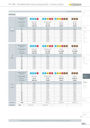 HF UNI - Variable Helix and unequal pitch - Corner radius CUTTING PARAMETERS INFO HF842 Material GroupISO 513 P1 P2 P7 K1 P3 P4 M1 K2 K3 P5 M2 M3 K4 S1 S4 S2 S3 S5 Hardness/Rm ≤700 N/mm² 600÷1000 N/mm² ≤35 HRC ≤40 HRC ° x ae 15° x D 10° x D 5° x D 5° x D Vc (m/min) 130÷150 80÷100 60÷80 30÷50 D fz(mm)(mm/z) fz(mm/z) fz(mm/z) fz(mm/z) CARBIDEDRILLS RAMPING 6 0.022 0.020 0.019 0.026 PU-HPU 8 0.028 0.026 0.024 0.034 TA-4HTA 10 0.034 0.031 0.029 0.040 SUH 12 0.038 0.035 0.034 0.046 ALH 14 0.043 0.040 0.038 0.052 HRC 16 0.048 0.044 0.042 0.058 SUH MINI 18 0.053 0.048 0.046 0.063 HL 20 0.058 0.054 0.051 0.070 HSD C-SD-TA Material Group P1 P2 P7 K1 P3 P4 M1 K2 K3 P5 M2 M3 K4 S1 S4 S2 S3 S5 ISO 513 Hardness/Rm ≤700 N/mm² 600÷1000 N/mm² ≤35 HRC ≤40 HRC ap x ae D x 0.4D D x 0.4D D x 0.25D D x 0.25D Vc (m/min) 130÷150 80÷100 60÷80 30÷50 D fz fz fz fz (mm) (mm/z) (mm/z) (mm/z) (mm/z) HSS VERTICAL 6 0.027 0.024 0.020 0.019 DRILLS 8 0.035 0.032 0.026 0.025 10 0.042 0.038 0.032 0.029 LFTA 12 0.048 0.043 0.036 0.034 SUTA 14 0.054 0.049 0.041 0.038 HSS-HSS/CO 16 0.060 0.054 0.045 0.042 18 0.066 0.059 0.050 0.046 20 0.073 0.066 0.055 0.051 Material GroupISO 513 P1 P2 P7 K1 P3 P4 M1 K2 K3 P5 M2 M3 K4 S1 S4 S2 S3 S5 CARBIDE Hardness/Rm ≤700 N/mm² 600÷1000 N/mm² ≤35 HRC ≤40 HRC END-MILLS ap x ae DxD DxD 0.5D x D 0.5D x D Vc (m/min) 100÷120 60÷80 45÷65 20÷40 G2 MDTA D fz fz fz fz HF VH/UP (mm) (mm/z) (mm/z) (mm/z) (mm/z) MEF 3 0.007 0.006 0.006 0.008 ALU 4 0.009 0.008 0.007 0.010 MEX/MH DRILLING 5 0.012 0.010 0.009 0.013 UH/MH 6 0.014 0.012 0.011 0.015 8 0.018 0.016 0.014 0.019 10 0.021 0.019 0.017 0.023 12 0.024 0.022 0.019 0.026 14 0.027 0.024 0.022 0.030 16 0.030 0.027 0.024 0.033 18 0.033 0.030 0.026 0.036 20 0.037 0.033 0.029 0.040 HSSEND-MILLS ap x ae ≤ D5 0.5D x D 0.5D x D 0.25D x D 0.25D x D ap x ae ≤ D5 1.5D x 0.1D 1.5D x 0.1D CARBIDE BURRS PARAMETERS SUGGESTED WITH HIGH POWER MILLING CHUCK AND STABLE MACHINING CONDITION 403