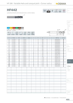 HF UNI - Variable Helix and unequal pitch - Corner radius HF442 OSAWANORM INFO cylindrical shank and reduced neck, corner radius CR CARBIDE DRILLS PU-HPU TA-4HTA P M K N S H SUH ALH H H H H CR HRC H 1st choice I suitable SUH MINI HL 1.5D HSD SLOTTING SIDE MILLING HELICAL RAMPING VERTICAL DRILLING TROCHOIDAL C-SD-TA D D Tol. CR CR Tol. d(h6) l l1 d1 L z EDP No. Stock 3 0/-0.030 0.30 +/-0.020 6 9 15 2.80 57 4 HF44203030 h 3 0/-0.030 0.50 +/-0.020 6 9 15 2.80 57 4 HF44205030 h 4 0/-0.030 0.30 +/-0.020 6 11 18 3.80 57 4 HF44203040 h 4 0/-0.030 0.50 +/-0.020 6 11 18 3.80 57 4 HF44205040 h 5 0/-0.030 0.30 +/-0.020 6 13 19 4.80 57 4 HF44203050 h HSS 5 0/-0.030 0.50 +/-0.020 6 13 19 4.80 57 4 HF44205050 h DRILLS 6 0/-0.030 0.30 +/-0.020 6 13 20 5.80 57 4 HF44203060 h 6 0/-0.030 0.50 +/-0.020 6 13 20 5.80 57 4 HF44205060 h LFTA 6 0/-0.030 1.00 +/-0.020 6 13 20 5.80 57 4 HF44210060 h SUTAHSS-HSS/CO 8 0/-0.030 0.50 +/-0.020 8 20 26 7.80 64 4 HF44205080 h 8 0/-0.030 1.00 +/-0.020 8 20 26 7.80 64 4 HF44210080 h 10 0/-0.030 0.50 +/-0.020 10 22 30 9.80 72 4 HF44205100 h 10 0/-0.030 1.00 +/-0.020 10 22 30 9.80 72 4 HF44210100 h 12 0/-0.030 0.50 +/-0.020 12 26 36 11.80 83 4 HF44205120 h 12 0/-0.030 1.00 +/-0.020 12 26 36 11.80 83 4 HF44210120 h 14 0/-0.030 1.00 +/-0.020 14 26 36 13.70 83 4 HF44210140 h CARBIDE 16 0/-0.030 1.00 +/-0.020 16 32 42 15.70 92 4 HF44210160 h END-MILLS 16 0/-0.030 2.00 +/-0.020 16 32 42 15.70 92 4 HF44220160 h 20 0/-0.030 1.00 +/-0.020 20 38 50 19.70 104 4 HF44210200 h G2 MDTA 20 0/-0.030 2.00 +/-0.020 20 38 50 19.70 104 4 HF44220200 h HF VH/UP MEF ALU MEX/MH UH/MH HSS END-MILLS CARBIDE BURRS h stock standard f non-standard stock m stock exhaustion 405