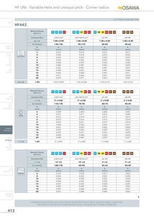 HF UNI - Variable Helix and unequal pitch - Corner radius CUTTING PARAMETERS INFO HF443 Material GroupISO 513 P1 P2 P7 K1 P3 P4 M1 K2 K3 P5 M2 M3 K4 S1 S4 S2 S3 S5 Hardness/Rm ≤700 N/mm² 600÷1000 N/mm² ≤35 HRC ≤40 HRC ap x ae 1.5D x 0.5D 1.5D x 0.5D 1.2D x 0.3D 1.2D x 0.3D Vc (m/min) 130÷150 90÷110 60÷80 40÷60 CARBIDEDRILLS D fz fz fz fz(mm)(mm/z)(mm/z)(mm/z)(mm/z) 3 0.015 0.014 0.012 0.017 PU-HPU TA-4HTA SIDE MILLINGSUH 45 0.0200.025 0.0180.022 0.0160.020 0.0220.027 ALH 6 0.029 0.026 0.023 0.032 HRC 8 0.038 0.034 0.030 0.042 SUH MINI 10 0.045 0.041 0.036 0.050 HL 12 0.052 0.047 0.041 0.057 HSD 14 0.058 0.052 0.047 0.064 C-SD-TA 16 0.065 0.058 0.052 0.071 18 0.071 0.064 0.057 0.078 20 0.079 0.071 0.063 0.087 ap x ae ≤ D5 1.5D x 0.25D 1.5D x 0.25D 1.2D x 0.1D 1.2D x 0.1D Material Group P1 P2 P7 K1 P3 P4 M1 K2 K3 P5 M2 M3 K4 S1 S4 S2 S3 S5 ISO 513 HSS Hardness/Rm ≤700 N/mm² 600÷1000 N/mm² ≤35 HRC ≤40 HRC DRILLS ° x ae 5° x 0.4D 4° x 0.4D 3° x 0.4D 3° x 0.4D LFTA Vc (m/min) 110÷130 70÷90 50÷70 30÷50 SUTA D fz fz fz fz HSS-HSS/CO (mm) (mm/z) (mm/z) (mm/z) (mm/z) 3 0.009 0.009 0.008 0.007 4 0.012 0.011 0.010 0.009 HELICAL 5 0.015 0.014 0.012 0.012 6 0.018 0.016 0.015 0.014 8 0.023 0.021 0.019 0.018 10 0.028 0.026 0.023 0.021 12 0.031 0.029 0.026 0.024 CARBIDEEND-MILLS 14 0.035 0.033 0.029 0.027 16 0.039 0.037 0.032 0.030 G2 18 0.043 0.040 0.036 0.033 MDTA 20 0.048 0.045 0.039 0.037 HF VH/UPMEF ° x ae ≤ D5 2° x 0.4D 2° x 0.4D 1° x 0.4D 1° x 0.4D ALU MEX/MH UH/MH Material Group P1 P2 P7 K1 P3 P4 M1 K2 K3 P5 M2 M3 K4 S1 S4 S2 S3 S5 ISO 513 Hardness/Rm ≤700 N/mm² 600÷1000 N/mm² ≤35 HRC ≤40 HRC ° x ae 15° x D 10° x D 5° x D 5° x D Vc (m/min) 100÷120 60÷80 45÷65 30÷40 HSSEND-MILLS D fz fz fz fz(mm)(mm/z)(mm/z)(mm/z)(mm/z) RAMPING 6 0.019 0.018 0.017 0.023 8 0.025 0.023 0.022 0.030 10 0.030 0.028 0.026 0.036 12 0.034 0.032 0.030 0.042 14 0.039 0.036 0.034 0.047 16 0.043 0.040 0.038 0.052 18 0.047 0.044 0.042 0.057 20 0.052 0.048 0.046 0.063 CARBIDE BURRS PARAMETERS SUGGESTED WITH HIGH PRECISION WELDON CHUCK AND STABLE MACHINING CONDITION. FOR APPLICATION ON HIGH POWER MILLING CHUCK, PLEASE REFER TO HF442 PARAMETERS. 412