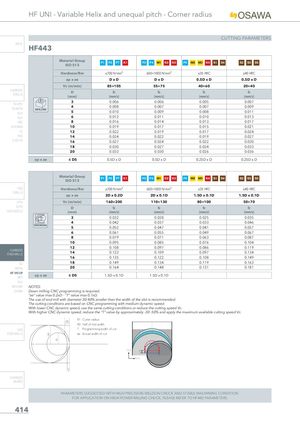 HF UNI - Variable Helix and unequal pitch - Corner radius CUTTING PARAMETERS INFO HF443 Material GroupISO 513 P1 P2 P7 K1 P3 P4 M1 K2 K3 P5 M2 M3 K4 S1 S4 S2 S3 S5 Hardness/Rm ≤700 N/mm² 600÷1000 N/mm² ≤35 HRC ≤40 HRC ap x ae DxD DxD 0.5D x D 0.5D x D Vc (m/min) 85÷105 55÷75 40÷60 20÷40 CARBIDEDRILLS D fz fz fz fz(mm)(mm/z)(mm/z)(mm/z)(mm/z) 3 0.006 0.006 0.005 0.007 PU-HPU TA-4HTA DRILLINGSUH 45 0.0080.010 0.0070.009 0.0070.008 0.0090.011 ALH 6 0.012 0.011 0.010 0.013 HRC 8 0.016 0.014 0.013 0.017 SUH MINI 10 0.019 0.017 0.015 0.021 HL 12 0.022 0.019 0.017 0.024 HSD 14 0.024 0.022 0.019 0.027 C-SD-TA 16 0.027 0.024 0.022 0.030 18 0.030 0.027 0.024 0.033 20 0.033 0.030 0.026 0.036 ap x ae ≤ D5 0.5D x D 0.5D x D 0.25D x D 0.25D x D Material Group P1 P2 P7 K1 P3 P4 M1 K2 K3 P5 M2 M3 K4 S1 S4 S2 S3 S5 ISO 513 HSS Hardness/Rm ≤700 N/mm² 600÷1000 N/mm² ≤35 HRC ≤40 HRC DRILLS ap x ae 2D x 0.2D 2D x 0.1D 1.5D x 0.1D 1.5D x 0.1D LFTA Vc (m/min) 160÷200 110÷130 80÷100 50÷70 SUTA D fz fz fz fz HSS-HSS/CO (mm) (mm/z) (mm/z) (mm/z) (mm/z) 3 0.032 0.028 0.025 0.035 4 0.042 0.037 0.033 0.046 TROCHOIDAL 5 0.052 0.047 0.041 0.057 6 0.061 0.055 0.049 0.067 8 0.079 0.071 0.063 0.087 10 0.095 0.085 0.076 0.104 12 0.108 0.097 0.086 0.119 CARBIDEEND-MILLS 14 0.122 0.109 0.097 0.134 16 0.135 0.122 0.108 0.149 G2 18 0.149 0.134 0.119 0.163 MDTA 20 0.164 0.148 0.131 0.181 HF VH/UPMEF ap x ae ≤ D5 1.5D x 0.1D 1.5D x 0.1D ALU MEX/MH NOTES: UH/MH Down milling CNC programming is required. “ae” value max 0.2xD - “T” value max 0.1xD. The use of end mill with diameter 30-40% smaller than the width of the slot is recommended. The cutting conditions are based on CNC programming with medium dynamic speed. With lower CNC dynamic speed, use the same cutting conditions or reduce the cutting speed Vc. With higher CNC dynamic speed, reduce the “T” value by approximately -30 -50% and apply the maximum available cutting speed Vc. ae R1 Cutter radius R2 Half of slot width HSS T Programming width of cut END-MILLS ae Actual width of cut Y (+) Y X (+) T CARBIDE BURRS PARAMETERS SUGGESTED WITH HIGH PRECISION WELDON CHUCK AND STABLE MACHINING CONDITION. FOR APPLICATION ON HIGH POWER MILLING CHUCK, PLEASE REFER TO HF442 PARAMETERS. 414 R2 R1