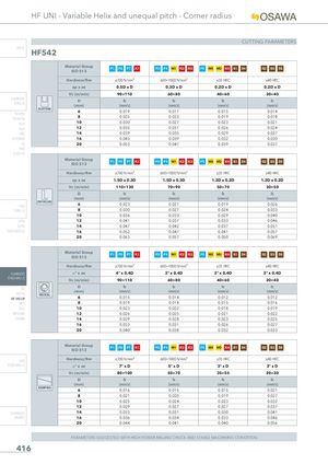 HF UNI - Variable Helix and unequal pitch - Corner radius CUTTING PARAMETERS INFO HF542 Material GroupISO 513 P1 P2 P7 K1 P3 P4 M1 K2 K3 P5 M2 M3 K4 S1 S4 S2 S3 S5 Hardness/Rm ≤700 N/mm² 600÷1000 N/mm² ≤35 HRC ≤40 HRC ap x ae 0.5D x D 0.3D x D 0.2D x D 0.2D x D Vc (m/min) 90÷110 60÷80 40÷60 20÷40 CARBIDEDRILLS D fz fz fz fz(mm)(mm/z)(mm/z)(mm/z)(mm/z) SLOTTING 6 0.019 0.017 0.015 0.014 PU-HPU TA-4HTA 8 0.025 0.023 0.019 0.018 SUH 10 0.030 0.027 0.023 0.021 ALH 12 0.035 0.031 0.026 0.024 HRC 14 0.039 0.035 0.029 0.027 SUH MINI 16 0.043 0.039 0.032 0.030 HL 20 0.053 0.047 0.039 0.037 HSD C-SD-TA Material Group P1 P2 P7 K1 P3 P4 M1 K2 K3 P5 M2 M3 K4 S1 S4 S2 S3 S5 ISO 513 Hardness/Rm ≤700 N/mm² 600÷1000 N/mm² ≤35 HRC ≤40 HRC ap x ae 1.5D x 0.3D 1.5D x 0.3D 1.2D x 0.2D 1.2D x 0.2D Vc (m/min) 110÷130 70÷90 50÷70 30÷50 D fz fz fz fz (mm) (mm/z) (mm/z) (mm/z) (mm/z) SIDE MILLINGHSS 6 0.023 0.021 0.019 0.026 DRILLS 8 0.030 0.027 0.024 0.033 10 0.036 0.033 0.029 0.040 LFTA 12 0.041 0.037 0.033 0.046 SUTA 14 0.047 0.042 0.037 0.051 HSS-HSS/CO 16 0.052 0.047 0.041 0.057 20 0.063 0.057 0.050 0.069 Material GroupISO 513 P1 P2 P7 K1 P3 P4 M1 K2 K3 P5 M2 M3 K4 S1 S4 S2 S3 S5 Hardness/Rm ≤700 N/mm² 600÷1000 N/mm² ≤35 HRC ≤40 HRC CARBIDE ° x ae 4° x 0.4D 3° x 0.4D 3° x 0.4D 2° x 0.4D END-MILLS Vc (m/min) 90÷110 60÷80 40÷60 20÷40 G2 D fz fz fz fz MDTA HELICAL (mm) (mm/z) (mm/z) (mm/z) (mm/z) HF VH/UP 6 0.015 0.014 0.012 0.012 MEF 8 0.019 0.018 0.015 0.016 ALU 10 0.023 0.022 0.018 0.019 MEX/MH 12 0.026 0.025 0.021 0.022 UH/MH 14 0.029 0.028 0.023 0.025 16 0.033 0.031 0.026 0.027 20 0.040 0.038 0.032 0.033 Material Group P1 P2 P7 K1 P3 P4 M1 K2 K3 P5 M2 M3 K4 S1 S4 S2 S3 S5 ISO 513 HSS Hardness/Rm ≤700 N/mm² 600÷1000 N/mm² ≤35 HRC ≤40 HRC END-MILLS ° x ae 7° x D 5° x D 3° x D 3° x D Vc (m/min) 80÷100 50÷70 35÷55 20÷30 D fz fz fz fz (mm) (mm/z) (mm/z) (mm/z) (mm/z) RAMPING 6 0.016 0.015 0.015 0.021 8 0.021 0.020 0.019 0.027 10 0.025 0.024 0.023 0.032 12 0.029 0.027 0.027 0.037 CARBIDE 14 0.033 0.031 0.030 0.041 BURRS 16 0.036 0.034 0.033 0.046 20 0.044 0.041 0.040 0.056 PARAMETERS SUGGESTED WITH HIGH POWER MILLING CHUCK AND STABLE MACHINING CONDITION 416