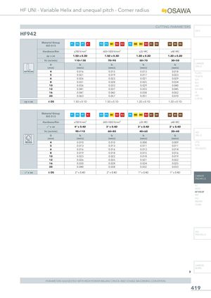 HF UNI - Variable Helix and unequal pitch - Corner radius CUTTING PARAMETERS INFO HF942 Material GroupISO 513 P1 P2 P7 K1 P3 P4 M1 K2 K3 P5 M2 M3 K4 S1 S4 S2 S3 S5 Hardness/Rm ≤700 N/mm² 600÷1000 N/mm² ≤35 HRC ≤40 HRC ap x ae 1.5D x 0.3D 1.5D x 0.3D 1.2D x 0.2D 1.2D x 0.2D Vc (m/min) 110÷130 70÷90 50÷70 30÷50 D fz(mm)(mm/z) fz(mm/z) fz(mm/z) fz(mm/z) CARBIDEDRILLS SIDE MILLING 4 0.016 0.015 0.013 0.018 PU-HPU 5 0.021 0.019 0.017 0.023 TA-4HTA 6 0.026 0.023 0.021 0.029 SUH 8 0.031 0.028 0.025 0.034 ALH 10 0.036 0.033 0.029 0.040 HRC 12 0.041 0.037 0.033 0.045 SUH MINI 16 0.047 0.042 0.038 0.052 HL 20 0.063 0.057 0.051 0.070 HSD C-SD-TA ap x ae ≤ D5 1.5D x 0.1D 1.5D x 0.1D 1.2D x 0.1D 1.2D x 0.1D Material GroupISO 513 P1 P2 P7 K1 P3 P4 M1 K2 K3 P5 M2 M3 K4 S1 S4 S2 S3 S5 Hardness/Rm ≤700 N/mm² 600÷1000 N/mm² ≤35 HRC ≤40 HRC ° x ae 4° x 0.4D 3° x 0.4D 3° x 0.4D 2° x 0.4D Vc (m/min) 90÷110 60÷80 40÷60 20÷40 HSS D fz fz fz fz DRILLS (mm) (mm/z) (mm/z) (mm/z) (mm/z) HELICAL 4 0.010 0.010 0.008 0.009 LFTA 5 0.013 0.013 0.011 0.011 SUTA 6 0.016 0.016 0.013 0.014 HSS-HSS/CO 8 0.019 0.018 0.015 0.016 10 0.023 0.022 0.018 0.019 12 0.026 0.025 0.021 0.022 16 0.030 0.028 0.024 0.025 20 0.040 0.038 0.032 0.033 ° x ae ≤ D5 2° x 0.4D 2° x 0.4D 1° x 0.4D 1° x 0.4D CARBIDE END-MILLS G2 MDTA HF VH/UP MEF ALU MEX/MH UH/MH HSS END-MILLS CARBIDE BURRS PARAMETERS SUGGESTED WITH HIGH POWER MILLING CHUCK AND STABLE MACHINING CONDITION 419