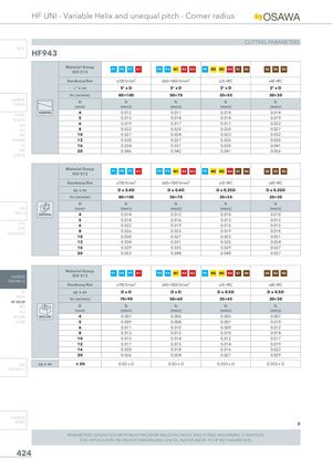 HF UNI - Variable Helix and unequal pitch - Corner radius CUTTING PARAMETERS INFO HF943 Material GroupISO 513 P1 P2 P7 K1 P3 P4 M1 K2 K3 P5 M2 M3 K4 S1 S4 S2 S3 S5 Hardness/Rm ≤700 N/mm² 600÷1000 N/mm² ≤35 HRC ≤40 HRC ° x ae 5° x D 5° x D 3° x D 3° x D Vc (m/min) 80÷100 50÷70 35÷55 20÷30 CARBIDEDRILLS D fz fz fz fz(mm)(mm/z)(mm/z)(mm/z)(mm/z) RAMPING 4 0.012 0.011 0.010 0.014 PU-HPU TA-4HTA 5 0.015 0.014 0.014 0.019 SUH 6 0.019 0.017 0.017 0.023 ALH 8 0.022 0.020 0.020 0.027 HRC 10 0.027 0.024 0.023 0.032 SUH MINI 12 0.030 0.027 0.026 0.036 HL 16 0.034 0.031 0.030 0.041 HSD 20 0.046 0.042 0.041 0.056 C-SD-TA Material Group P1 P2 P7 K1 P3 P4 M1 K2 K3 P5 M2 M3 K4 S1 S4 S2 S3 S5 ISO 513 Hardness/Rm ≤700 N/mm² 600÷1000 N/mm² ≤35 HRC ≤40 HRC ap x ae D x 0.4D D x 0.4D D x 0.25D D x 0.25D Vc (m/min) 80÷100 50÷70 35÷55 20÷30 D fz fz fz fz HSS (mm) (mm/z) (mm/z) (mm/z) (mm/z) DRILLS VERTICAL 4 0.014 0.012 0.010 0.010 5 0.018 0.016 0.013 0.012 LFTA 6 0.022 0.019 0.016 0.015 SUTAHSS-HSS/CO 8 0.026 0.023 0.019 0.018 10 0.030 0.027 0.023 0.021 12 0.034 0.031 0.026 0.024 16 0.039 0.035 0.029 0.027 20 0.053 0.048 0.040 0.037 Material Group P1 P2 P7 K1 P3 P4 M1 K2 K3 P5 M2 M3 K4 S1 S4 S2 S3 S5 CARBIDE ISO 513 END-MILLS Hardness/Rm ≤700 N/mm² 600÷1000 N/mm² ≤35 HRC ≤40 HRC G2 ap x ae DxD DxD D x 0.5D D x 0.5D MDTA Vc (m/min) 70÷90 50÷60 35÷45 20÷30 HF VH/UP MEF D fz fz fz fz ALU (mm) (mm/z) (mm/z) (mm/z) (mm/z) MEX/MH DRILLING 4 0.007 0.006 0.005 0.007 UH/MH 5 0.009 0.008 0.007 0.010 6 0.011 0.010 0.009 0.012 8 0.013 0.012 0.010 0.014 10 0.015 0.014 0.012 0.017 12 0.017 0.015 0.014 0.019 16 0.020 0.018 0.016 0.022 20 0.026 0.024 0.021 0.029 HSS ap x ae ≤ D5 0.5D x D 0.5D x D 0.25D x D 0.25D x D END-MILLS CARBIDE BURRS PARAMETERS SUGGESTED WITH HIGH PRECISION WELDON CHUCK AND STABLE MACHINING CONDITION. FOR APPLICATION ON HIGH POWER MILLING CHUCK, PLEASE REFER TO HF942 PARAMETERS. 424