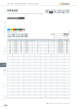 HF UNI - Variable helix - Corner radius INFO HF642 OSAWANORM cylindrical shank, 5F ideal for trochoidal milling, corner radius CR CARBIDE DRILLS PU-HPU TA-4HTA SUH P M K N S H ALH HRC H H H HSUH MINIH 1st choiceI suitable CR HL HSD C-SD-TA SIDE MILLING HELICAL RAMPING VERTICAL TROCHOIDAL D D Tol. CR CR Tol. d(h6) l l1 L z EDP No. Stock 4 0/-0.020 0.10 0/-0.015 6 12 57 5 HF64201040 h 5 0/-0.020 0.10 0/-0.015 6 13 57 5 HF64201050 h 6 0/-0.020 0.10 0/-0.015 6 13 57 5 HF64201060 h 8 0/-0.020 0.20 0/-0.015 8 20 64 5 HF64202080 h 10 0/-0.020 0.20 0/-0.020 10 22 72 5 HF64202100 h HSS DRILLS 12 0/-0.020 0.30 0/-0.020 12 26 83 5 HF64203120 h 16 0/-0.020 0.30 0/-0.020 16 32 92 5 HF64203160 h LFTA 20 0/-0.020 0.30 0/-0.020 20 38 104 5 HF64203200 h SUTA HSS-HSS/CO CARBIDE END-MILLS G2 MDTA HF VH/UP MEF ALU MEX/MH UH/MH HSS END-MILLS CARBIDE BURRS h stock standard f non-standard stock m stock exhaustion 426