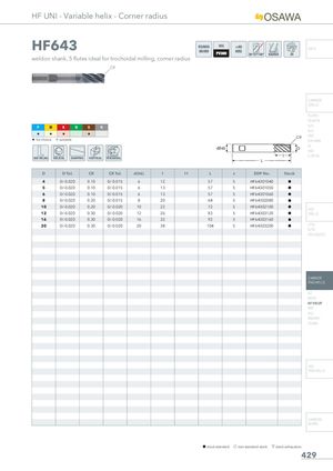 HF UNI - Variable helix - Corner radius HF643 OSAWANORM INFO weldon shank, 5 flutes ideal for trochoidal milling, corner radius CR CARBIDE DRILLS PU-HPU TA-4HTA P M K N S H SUH ALH H H H HH 1st choiceI suitable CR HRCSUH MINI HL HSD SIDE MILLING HELICAL RAMPING VERTICAL TROCHOIDAL C-SD-TA D D Tol. CR CR Tol. d(h6) l l1 L z EDP No. Stock 4 0/-0.020 0.10 0/-0.015 6 12 57 5 HF64301040 h 5 0/-0.020 0.10 0/-0.015 6 13 57 5 HF64301050 h 6 0/-0.020 0.10 0/-0.015 6 13 57 5 HF64301060 h 8 0/-0.020 0.20 0/-0.015 8 20 64 5 HF64302080 h 10 0/-0.020 0.20 0/-0.020 10 22 72 5 HF64302100 h HSS 12 0/-0.020 0.30 0/-0.020 12 26 83 5 HF64303120 h DRILLS 16 0/-0.020 0.30 0/-0.020 16 32 92 5 HF64303160 h 20 0/-0.020 0.30 0/-0.020 20 38 104 5 HF64303200 h LFTA SUTA HSS-HSS/CO CARBIDE END-MILLS G2 MDTA HF VH/UP MEF ALU MEX/MH UH/MH HSS END-MILLS CARBIDE BURRS h stock standard f non-standard stock m stock exhaustion 429