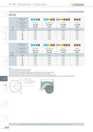 HF UNI - Variable helix - Corner radius CUTTING PARAMETERS INFO HF742 Material GroupISO 513 P1 P2 P7 K1 P3 P4 M1 K2 K3 P5 M2 M3 K4 S1 S4 S2 S3 S5 Hardness/Rm ≤700 N/mm² 600÷1000 N/mm² ≤35 HRC ≤40 HRC ap x ae D x 0.4D D x 0.4D D x 0.25D D x 0.25D Vc (m/min) 80÷100 50÷70 35÷55 20÷30 CARBIDEDRILLS VERTICAL D(mm) fz(mm/z) fz(mm/z) fz(mm/z) fz(mm/z) 6 0.022 0.019 0.016 0.015 PU-HPU TA-4HTA 8 0.026 0.023 0.019 0.018 SUH 10 0.030 0.027 0.023 0.021 ALH 12 0.034 0.031 0.026 0.024 HRC 16 0.039 0.035 0.029 0.027 SUH MINI 20 0.053 0.048 0.040 0.037 HL HSD C-SD-TA Material GroupISO 513 P1 P2 P7 K1 P3 P4 M1 K2 K3 P5 M2 M3 K4 S1 S4 S2 S3 S5 Hardness/Rm ≤700 N/mm² 600÷1000 N/mm² ≤35 HRC ≤40 HRC ap x ae 3D x 0.1D 3D x 0.1D 2D x 0.1D 2D x 0.1D Vc (m/min) 130÷170 100÷120 70÷90 40÷60 D fz fz fz fz TROCHOIDAL (mm) (mm/z) (mm/z) (mm/z) (mm/z) 6 0.054 0.049 0.043 0.059 HSS 8 0.064 0.058 0.051 0.070 DRILLS 10 0.076 0.068 0.061 0.084 12 0.086 0.077 0.069 0.095 LFTA 16 0.098 0.088 0.078 0.108 SUTAHSS-HSS/CO 20 0.132 0.119 0.106 0.145 NOTES: Down milling CNC programming is required. “ae” value max 0.2xD - “T” value max 0.1xD. The use of end mill with diameter 30-40% smaller than the width of the slot is recommended. The cutting conditions are based on CNC programming with medium dynamic speed. With lower CNC dynamic speed, use the same cutting conditions or reduce the cutting speed Vc. With higher CNC dynamic speed, reduce the “T” value by approximately -30 -50% and apply the maximum available cutting speed Vc. CARBIDE END-MILLS ae R1 Cutter radius R2 Half of slot width G2 T Programming width of cut MDTA ae Actual width of cut HF VH/UP MEF ALUMEX/MH Y (+) Y UH/MH X (+) T HSS END-MILLS CARBIDE BURRS PARAMETERS SUGGESTED WITH HIGH POWER MILLING CHUCK AND STABLE MACHINING CONDITION 434 R2 R1