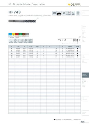 HF UNI - Variable helix - Corner radius HF743 OSAWANORM INFO weldon shank, long 5 flutes ideal for trochoidal milling, corner radius CR CARBIDE DRILLS PU-HPU TA-4HTA P M K N S H SUH ALH H H H HH 1st choiceI suitable CR HRCSUH MINI HL HSD SIDE MILLING HELICAL RAMPING VERTICAL TROCHOIDAL C-SD-TA D D Tol. CR CR Tol. d(h6) l l1 L z EDP No. Stock 6 0/-0.030 0.10 0/-0.015 6 25 75 5 HF7430106075 h 8 0/-0.030 0.20 0/-0.015 8 25 75 5 HF7430208075 h 10 0/-0.035 0.20 0/-0.020 10 38 100 5 HF74302100100 h 12 0/-0.035 0.30 0/-0.020 12 45 100 5 HF74303120100 h 16 0/-0.035 0.30 0/-0.020 16 55 125 5 HF74303160125 h HSS 20 0/-0.035 0.30 0/-0.020 20 65 125 5 HF74303200125 h DRILLS LFTA SUTA HSS-HSS/CO CARBIDE END-MILLS G2 MDTA HF VH/UP MEF ALU MEX/MH UH/MH HSS END-MILLS CARBIDE BURRS h stock standard f non-standard stock m stock exhaustion 435