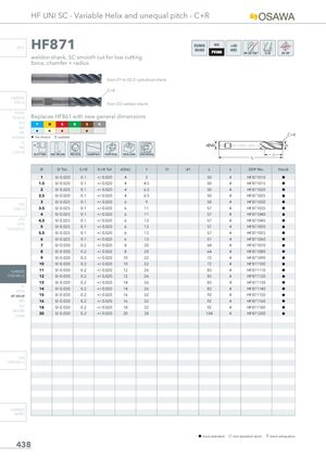 HF UNI SC - Variable Helix and unequal pitch - C+R INFO HF871 OSAWANORM weldon shank, SC smooth cut for low cutting force, chamfer + radius from D1 to D2.5: cylindrical shank C+R CARBIDE DRILLS from D3: weldon shank PU-HPU TA-4HTA Replaces HF861 with new general dimensions SUH P M K N S H ALHHRC SUH MINI 1st choice suitable C+R HL HSD 2D C-SD-TA SLOTTING SIDE MILLING HELICAL RAMPING VERTICAL DRILLING TROCHOIDAL D D Tol. C+R C+R Tol d(h6) l l1 d1 L z EDP No. Stock 1 0/-0.020 0.1 +/-0.020 4 3 50 4 HF871010 h 1.5 0/-0.020 0.1 +/-0.020 4 4.5 50 4 HF871015 h 2 0/-0.020 0.1 +/-0.020 4 6.5 50 4 HF871020 h 2.5 0/-0.020 0.1 +/-0.020 4 6.5 50 4 HF871025 h 3 0/-0.025 0.1 +/-0.020 6 9 50 4 HF871030 h HSS DRILLS 3.5 0/-0.025 0.1 +/-0.020 6 11 57 4 HF871035 h 4 0/-0.025 0.1 +/-0.020 6 11 57 4 HF871040 h LFTA 4.5 0/-0.025 0.1 +/-0.020 6 13 57 4 HF871045 h SUTAHSS-HSS/CO 5 0/-0.025 0.1 +/-0.020 6 13 57 4 HF871050 h 5.5 0/-0.025 0.1 +/-0.020 6 13 57 4 HF871055 h 6 0/-0.025 0.1 +/-0.020 6 13 57 4 HF871060 h 7 0/-0.030 0.2 +/-0.020 8 20 64 4 HF871070 h 8 0/-0.030 0.2 +/-0.020 8 20 64 4 HF871080 h 9 0/-0.030 0.2 +/-0.020 10 22 72 4 HF871090 h 10 0/-0.030 0.2 +/-0.020 10 22 72 4 HF871100 h CARBIDE 11 0/-0.030 0.2 +/-0.020 12 26 83 4 HF871110 h END-MILLS 12 0/-0.030 0.2 +/-0.020 12 26 83 4 HF871120 h 13 0/-0.030 0.2 +/-0.020 14 26 83 4 HF871130 h G2 14 0/-0.030 0.2 +/-0.020 14 26 83 4 HF871140 h MDTA HF VH/UP 15 0/-0.030 0.2 +/-0.020 16 32 92 4 HF871150 h MEF 16 0/-0.030 0.2 +/-0.020 16 32 92 4 HF871160 h ALU 18 0/-0.030 0.2 +/-0.020 18 32 92 4 HF871180 h MEX/MHUH/MH 20 0/-0.030 0.2 +/-0.020 20 38 104 4 HF871200 h HSS END-MILLS CARBIDE BURRS h stock standard f non-standard stock m stock exhaustion 438