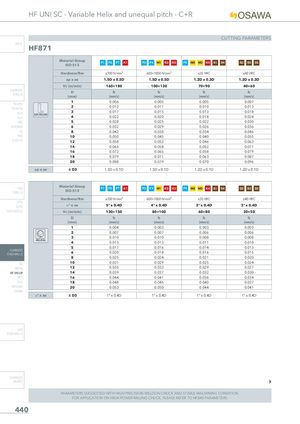 HF UNI SC - Variable Helix and unequal pitch - C+R CUTTING PARAMETERS INFO HF871 Material GroupISO 513 P1 P2 P7 K1 P3 P4 M1 K2 K3 P5 M2 M3 K4 S1 S4 S2 S3 S5 Hardness/Rm ≤700 N/mm² 600÷1000 N/mm² ≤35 HRC ≤40 HRC ap x ae 1.5D x 0.5D 1.5D x 0.5D 1.2D x 0.3D 1.2D x 0.3D Vc (m/min) 160÷180 100÷120 70÷90 40÷60 CARBIDEDRILLS D fz fz fz fz(mm)(mm/z)(mm/z)(mm/z)(mm/z) 1 0.006 0.005 0.005 0.007 PU-HPU TA-4HTA 2 0.012 0.011 0.010 0.013 SUH SIDE MILLINGALH 34 0.0170.022 0.0150.020 0.0130.018 0.0180.024 HRC 5 0.028 0.025 0.022 0.030 SUH MINI 6 0.032 0.029 0.026 0.036 HL 8 0.042 0.038 0.034 0.046 HSD 10 0.050 0.045 0.040 0.055 C-SD-TA 12 0.058 0.052 0.046 0.063 14 0.065 0.058 0.052 0.071 16 0.072 0.065 0.058 0.079 18 0.079 0.071 0.063 0.087 20 0.088 0.079 0.070 0.096 ap x ae ≤ D3 1.5D x 0.1D 1.5D x 0.1D 1.2D x 0.1D 1.2D x 0.1D HSSDRILLS Material Group P1 P2 P7 K1 P3 P4 M1 K2 K3 P5 M2 M3 K4 S1 S4 S2 S3 S5ISO 513 Hardness/Rm ≤700 N/mm² 600÷1000 N/mm² ≤35 HRC ≤40 HRC LFTA SUTA ° x ae 5° x 0.4D 4° x 0.4D 3° x 0.4D 3° x 0.4D HSS-HSS/CO Vc (m/min) 130÷150 80÷100 60÷80 30÷50 D fz fz fz fz (mm) (mm/z) (mm/z) (mm/z) (mm/z) 1 0.004 0.003 0.003 0.003 2 0.007 0.007 0.006 0.006 3 0.010 0.010 0.008 0.008 HELICAL 4 0.013 0.013 0.011 0.010 5 0.017 0.016 0.014 0.013 CARBIDEEND-MILLS 6 0.020 0.018 0.016 0.015 8 0.025 0.024 0.021 0.020 G2 10 0.031 0.029 0.025 0.024 MDTA 12 0.035 0.033 0.029 0.027 HF VH/UP 14 0.039 0.037 0.032 0.030 MEF 16 0.044 0.041 0.036 0.034 ALU 18 0.048 0.045 0.040 0.037 MEX/MH 20 0.053 0.050 0.044 0.041 UH/MH ° x ae ≤ D3 1° x 0.4D 1° x 0.4D 1° x 0.4D 1° x 0.4D HSS END-MILLS CARBIDE BURRS PARAMETERS SUGGESTED WITH HIGH PRECISION WELDON CHUCK AND STABLE MACHINING CONDITION. FOR APPLICATION ON HIGH POWER MILLING CHUCK, PLEASE REFER TO HF840 PARAMETERS. 440