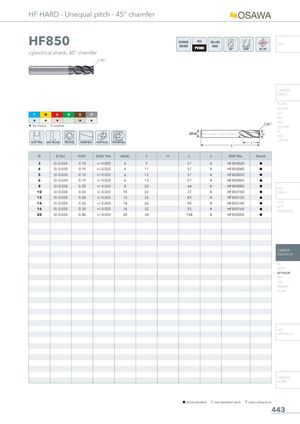 HF HARD - Unequal pitch - 45° chamfer HF850 OSAWANORM INFO cylindrical shank, 45° chamfer C45° CARBIDE DRILLS PU-HPU TA-4HTA P M K N S H SUH ALH H H H H HH 1st choiceI suitable C45° HRCSUH MINI HL HSD SLOTTING SIDE MILLING HELICAL RAMPING VERTICAL TROCHOIDAL C-SD-TA D D Tol. C45° C45° Tol. d(h6) l l1 L z EDP No. Stock 3 0/-0.030 0.10 +/-0.020 6 9 57 4 HF850030 h 4 0/-0.030 0.10 +/-0.020 6 11 57 4 HF850040 h 5 0/-0.030 0.10 +/-0.020 6 13 57 4 HF850050 h 6 0/-0.030 0.10 +/-0.020 6 13 57 4 HF850060 h 8 0/-0.030 0.20 +/-0.020 8 20 64 4 HF850080 h HSS 10 0/-0.030 0.20 +/-0.020 10 22 72 4 HF850100 h DRILLS 12 0/-0.030 0.20 +/-0.020 12 26 83 4 HF850120 h 14 0/-0.030 0.30 +/-0.020 14 26 90 4 HF850140 h LFTA 16 0/-0.030 0.30 +/-0.020 16 32 92 4 HF850160 h SUTAHSS-HSS/CO 20 0/-0.030 0.40 +/-0.020 20 38 104 4 HF850200 h CARBIDE END-MILLS G2 MDTA HF VH/UP MEF ALU MEX/MH UH/MH HSS END-MILLS CARBIDE BURRS h stock standard f non-standard stock m stock exhaustion 443
