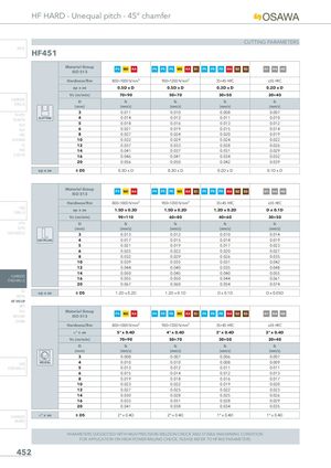 HF HARD - Unequal pitch - 45° chamfer CUTTING PARAMETERS INFO HF451 Material GroupISO 513 P4 M3 K4 P4 P5 P8 M3 K4 S1 P5 P8 P8 K4 S2 S3 H1 H4 H5 Hardness/Rm 800÷1000 N/mm² 900÷1200 N/mm² 35÷45 HRC ≤55 HRC ap x ae 0.5D x D 0.5D x D 0.3D x D 0.2D x D Vc (m/min) 70÷90 50÷70 30÷50 20÷40 CARBIDEDRILLS D fz fz fz fz(mm)(mm/z)(mm/z)(mm/z)(mm/z) 3 0.011 0.010 0.008 0.007 PU-HPU TA-4HTA SLOTTING 4 0.014 0.013 0.011 0.010 SUH 5 0.018 0.016 0.013 0.012 ALH 6 0.021 0.019 0.015 0.014 HRC 8 0.027 0.024 0.020 0.019 SUH MINI 10 0.032 0.029 0.024 0.022 HL 12 0.037 0.033 0.028 0.026 HSD 14 0.041 0.037 0.031 0.029 C-SD-TA 16 0.046 0.041 0.034 0.032 20 0.056 0.050 0.042 0.039 ap x ae ≤ D5 0.3D x D 0.3D x D 0.2D x D 0.1D x D Material Group P4 M3 K4 P4 P5 P8 M3 K4 S1 P5 P8 P8 K4 S2 S3 H1 H4 H5 ISO 513 Hardness/Rm 800÷1000 N/mm² 900÷1200 N/mm² 35÷45 HRC ≤55 HRC HSSDRILLS ap x ae 1.5D x 0.3D 1.5D x 0.2D 1.2D x 0.2D D x 0.1D Vc (m/min) 90÷110 60÷80 40÷60 30÷50 LFTA D fz fz fz fz SUTA (mm) (mm/z) (mm/z) (mm/z) (mm/z) HSS-HSS/CO 3 0.013 0.012 0.010 0.014 SIDE MILLING 4 0.017 0.015 0.014 0.019 5 0.021 0.019 0.017 0.023 6 0.025 0.022 0.020 0.027 8 0.032 0.029 0.026 0.035 10 0.039 0.035 0.031 0.042 12 0.044 0.040 0.035 0.048 14 0.050 0.045 0.040 0.055 CARBIDEEND-MILLS 16 0.055 0.050 0.044 0.061 20 0.067 0.060 0.054 0.074 G2 ap x ae ≤ D5 1.2D x 0.2D 1.2D x 0.1D D x 0.1D D x 0.05D MDTA HF VH/UP MEF ALU Material Group P4 M3 K4 P4 P5 P8 M3 K4 S1 P5 P8 P8 K4 S2 S3 H1 H4 H5 MEX/MH ISO 513 UH/MH Hardness/Rm 800÷1000 N/mm² 900÷1200 N/mm² 35÷45 HRC ≤55 HRC ° x ae 5° x 0.4D 4° x 0.4D 3° x 0.4D 2° x 0.4D Vc (m/min) 70÷90 50÷70 30÷50 20÷40 D fz fz fz fz (mm) (mm/z) (mm/z) (mm/z) (mm/z) 3 0.008 0.007 0.006 0.007 HSS HELICAL 4 0.010 0.010 0.008 0.009 END-MILLS 5 0.013 0.012 0.011 0.011 6 0.015 0.014 0.012 0.013 8 0.019 0.018 0.016 0.017 10 0.023 0.022 0.019 0.020 12 0.027 0.025 0.022 0.023 14 0.030 0.028 0.025 0.026 16 0.033 0.031 0.028 0.029 20 0.041 0.038 0.034 0.035 CARBIDE ° x ae ≤ D5 2° x 0.4D 2° x 0.4D 1° x 0.4D 1° x 0.4D BURRS PARAMETERS SUGGESTED WITH HIGH PRECISION WELDON CHUCK AND STABLE MACHINING CONDITION. FOR APPLICATION ON HIGH POWER MILLING CHUCK, PLEASE REFER TO HF450 PARAMETERS. 452