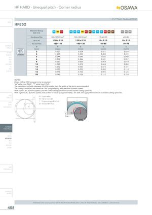 R2 R1 HF HARD - Unequal pitch - Corner radius CUTTING PARAMETERS INFO HF852 Material GroupISO 513 P4 M3 K4 P4 P5 P8 M3 K4 S1 P5 P8 P8 K4 S2 S3 H1 H4 H5 Hardness/Rm 800÷1000 N/mm² 900÷1200 N/mm² 35÷45 HRC ≤55 HRC ap x ae 1.5D x 0.1D 1.5D x 0.1D D x 0.1D D x 0.1D Vc (m/min) 130÷150 100÷120 60÷80 50÷70 CARBIDEDRILLS D fz fz fz fz(mm)(mm/z)(mm/z)(mm/z)(mm/z) 3 0.027 0.024 0.021 0.029 PU-HPU TA-4HTA TROCHOIDAL 4 0.035 0.032 0.028 0.039 SUH 5 0.044 0.040 0.035 0.048 ALH 6 0.052 0.046 0.041 0.057 HRC 8 0.067 0.060 0.054 0.074 SUH MINI 10 0.080 0.072 0.064 0.088 HL 12 0.092 0.083 0.073 0.101 HSD 14 0.103 0.093 0.083 0.114 C-SD-TA 16 0.115 0.103 0.092 0.126 20 0.140 0.126 0.112 0.154 NOTES: Down milling CNC programming is required. “ae” value max 0.2xD - “T” value max 0.1xD. The use of end mill with diameter 30-40% smaller than the width of the slot is recommended. The cutting conditions are based on CNC programming with medium dynamic speed. With lower CNC dynamic speed, use the same cutting conditions or reduce the cutting speed Vc. With higher CNC dynamic speed, reduce the “T” value by approximately -30 -50% and apply the maximum available cutting speed Vc. HSSDRILLS ae R1 Cutter radius R2 Half of slot width LFTA T Programming width of cut SUTA ae Actual width of cut HSS-HSS/CO Y (+) Y X (+) T CARBIDE END-MILLS G2 MDTA HF VH/UP MEF ALU MEX/MH UH/MH HSS END-MILLS CARBIDE BURRS PARAMETERS SUGGESTED WITH HIGH POWER MILLING CHUCK AND STABLE MACHINING CONDITION 458