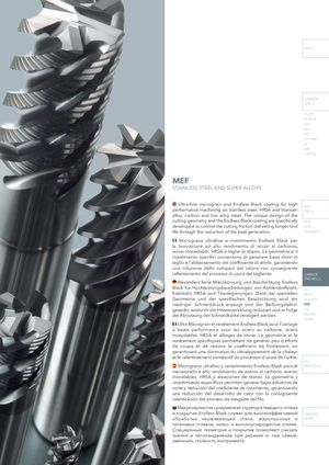 INFO CARBIDE DRILLS PU-HPU TA-4HTA SUH ALH HRC SUH MINI HL HSD C-SD-TA MEF STAINLESS STEEL AND SUPER ALLOYS Ultra-fine micrograin and Endless Black coating for high HSS performance machining on stainless steel, HRSA and titanium DRILLS alloy, carbon and low alloy steel. The unique design of the cutting geometry and the Endless Black coating are specifically LFTA developed to control the cutting friction delivering longer tool SUTA life through the reduction of the heat generation. HSS-HSS/CO Micrograna ultrafine e rivestimento Endless Black per la lavorazione ad alto rendimento di acciai al carbonio, acciai inossidabili, HRSA e leghe di titanio. La geometria e il rivestimento specifici consentono di generare bassi sforzi di taglio e l'abbassamento del coefficiente di attrito, garantendo una riduzione dello sviluppo del calore con conseguente rallentamento del processo di usura del tagliente. CARBIDE END-MILLS Besonders feine Mikrokörnung und Beschichtung Endless Black für Hochleistungsbearbeitungen von Kohlenstoffstahl, G2 Edelstahl, HRSA und Titanlegierungen. Dank der speziellen MDTA Geometrie und der spezifischen Beschichtung wird ein HF VH/UP niedriger Schneiddruck erzeugt und der Reibungsfaktor MEF gesenkt, wodurch die Hitzeentwicklung reduziert und in Folge ALU die Abnutzung der Schneidkante verzögert werden. MEX/MH UH/MH Ultra Micrograin et revêtement Endless Black pour l’usinage à haute performance pour les aciers au carbone, aciers inoxydables, HRSA et alliages de titane. La géométrie et le revêtement spécifiques permettent de générer peu d’efforts de coupe et de réduire le coefficient de frottement, en garantissant une diminution du développement de la chaleur et le ralentissement consécutif du processus d’usure de l’arête. HSS Micrograno ultrafino y revestimiento Endless Black para el END-MILLS mecanizado a alto rendimiento de aceros al carbono, aceros inoxidables, HRSA y aleaciones de titanio. La geometría y revestimiento específicos permiten generar bajos esfuerzos de corte y reducción del coeficiente de rozamiento, garantizando una reducción del desarrollo de calor con la consiguiente ralentización del proceso de desgaste del filo. Микрозернистая супермелкая структура твердого сплава и покрытие Endless Black служат для высокоэффективной CARBIDE обработки нержавеющей стали, жаропрочных и BURRS титановых сплавов, низко- и высокоуглеродистых сталей. Специальные геометрия и покрытие позволяют снизить трение и тепловыделение при резании и, тем самым, увеличить стойкость инструмента.