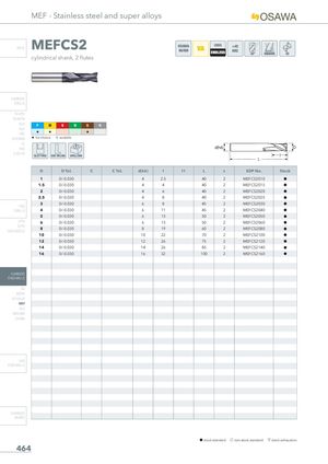 MEF - Stainless steel and super alloys INFO MEFCS2 OSAWA <45NORMHRC cylindrical shank, 2 flutes CARBIDE DRILLS PU-HPU TA-4HTA SUH P M K N S H ALH HRC H H H SUH MINI H 1st choice I suitable HL HSD C-SD-TA SLOTTING SIDE MILLING DRILLING D D Tol. C C Tol. d(h6) l l1 L z EDP No. Stock 1 0/-0.030 4 2.5 40 2 MEFCS2010 h 1.5 0/-0.030 4 4 40 2 MEFCS2015 h 2 0/-0.030 4 6 40 2 MEFCS2020 h 2.5 0/-0.030 4 8 40 2 MEFCS2025 h 3 0/-0.030 6 8 45 2 MEFCS2030 h HSS DRILLS 4 0/-0.030 6 11 45 2 MEFCS2040 h 5 0/-0.030 6 13 50 2 MEFCS2050 h LFTA 6 0/-0.030 6 13 50 2 MEFCS2060 h SUTAHSS-HSS/CO8 0/-0.030 8 19 60 2 MEFCS2080 h 10 0/-0.030 10 22 70 2 MEFCS2100 h 12 0/-0.030 12 26 75 2 MEFCS2120 h 14 0/-0.030 14 26 85 2 MEFCS2140 h 16 0/-0.030 16 32 100 2 MEFCS2160 h CARBIDE END-MILLS G2 MDTA HF VH/UP MEF ALU MEX/MH UH/MH HSS END-MILLS CARBIDE BURRS h stock standard f non-stock standard m stock exhaustion 464