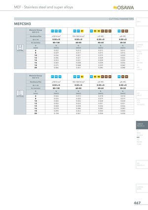 MEF - Stainless steel and super alloys CUTTING PARAMETERS INFO MEFCSH3 Material Group P1 P2 P3ISO 513 P4 P7 M1 P5 M2 M3 S1 S2 S4 P8 S3 S5 Hardness/Rm ≤700 N/mm² 700÷1000 N/mm² ≤35 HRC ≤45 HRC ap x ae 0.5D x D 0.5D x D 0.3D x D 0.2D x D Vc (m/min) 80÷100 60÷80 40÷60 30÷50 D fz(mm)(mm/z) fz(mm/z) fz(mm/z) fz(mm/z) CARBIDEDRILLS SLOTTING 6 0.022 0.013 0.012 0.012 PU-HPU 8 0.029 0.017 0.015 0.016 TA-4HTA 10 0.036 0.021 0.019 0.020 SUH 12 0.046 0.027 0.024 0.026 ALH 14 0.053 0.031 0.028 0.030 HRC 16 0.065 0.038 0.034 0.036 SUH MINI 18 0.075 0.044 0.039 0.042 HL 20 0.086 0.051 0.045 0.048 HSD C-SD-TA Material Group P1 P2 P3 P4 P7 M1 P5 M2 M3 S1 S2 S4 P8 S3 S5 ISO 513 Hardness/Rm ≤700 N/mm² 700÷1000 N/mm² ≤35 HRC ≤45 HRC ap x ae 0.5D x D 0.5D x D 0.3D x D 0.2D x D Vc (m/min) 80÷100 60÷80 40÷60 30÷50 D fz fz fz fz (mm) (mm/z) (mm/z) (mm/z) (mm/z) HSS SIDE MILLING 6 0.026 0.015 0.014 0.014 DRILLS 8 0.035 0.020 0.019 0.019 10 0.043 0.026 0.024 0.024 LFTA 12 0.055 0.033 0.031 0.031 SUTAHSS-HSS/CO 14 0.064 0.038 0.036 0.036 16 0.078 0.046 0.043 0.043 18 0.090 0.053 0.050 0.050 20 0.104 0.061 0.058 0.058 CARBIDE END-MILLS G2 MDTA HF VH/UP MEF ALU MEX/MH UH/MH HSS END-MILLS CARBIDE BURRS 467