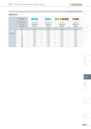 MEF - Stainless steel and super alloys CUTTING PARAMETERS INFO MEFCS4 Material Group P1 P2 P3ISO 513 P4 P7 M1 P5 M2 M3 S1 S2 S4 P8 S3 S5 Hardness/Rm ≤700 N/mm² 700÷1000 N/mm² ≤35 HRC ≤45 HRC ap x ae 1.5D x 0.1D 1.5D x 0.1D 1.5D x 0.1D 1.5D x 0.1D Vc (m/min) 90÷110 60÷80 40÷60 30÷50 D fz(mm)(mm/z) fz(mm/z) fz(mm/z) fz(mm/z) CARBIDEDRILLS 3 0.012 0.010 0.010 0.010 PU-HPU 4SIDE MILLING5 0.0150.018 0.0130.015 0.0120.014 0.012 TA-4HTA0.014SUH 6 0.023 0.020 0.018 0.018 ALH 8 0.030 0.026 0.024 0.024 HRC 10 0.038 0.032 0.030 0.030 SUH MINI 12 0.045 0.038 0.036 0.036 HL 14 0.052 0.044 0.042 0.042 HSD 16 0.058 0.049 0.046 0.046 C-SD-TA 18 0.066 0.056 0.053 0.053 20 0.075 0.064 0.060 0.060 HSS DRILLS LFTA SUTA HSS-HSS/CO CARBIDE END-MILLS G2 MDTA HF VH/UP MEF ALU MEX/MH UH/MH HSS END-MILLS CARBIDE BURRS 469
