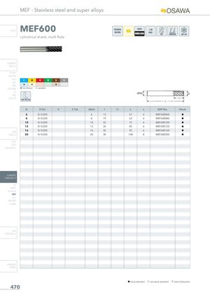 MEF - Stainless steel and super alloys INFO MEF600 OSAWA <45NORMHRC cylindrical shank, multi flute CARBIDE DRILLS PU-HPU TA-4HTA SUH P M K N S H ALH HRC H H H SUH MINI H 1st choice I suitable HL HSD C-SD-TA SIDE MILLING D D Tol. C C Tol. d(h6) l l1 L z EDP No. Stock 6 0/-0.030 6 13 57 6 MEF600060 h 8 0/-0.030 8 19 63 6 MEF600080 h 10 0/-0.030 10 22 72 6 MEF600100 h 12 0/-0.030 12 26 83 6 MEF600120 h 16 0/-0.030 16 32 92 6 MEF600160 h HSS DRILLS 20 0/-0.030 20 38 104 8 MEF600200 h LFTA SUTA HSS-HSS/CO CARBIDE END-MILLS G2 MDTA HF VH/UP MEF ALU MEX/MH UH/MH HSS END-MILLS CARBIDE BURRS h stock standard f non-stock standard m stock exhaustion 470