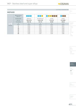 MEF - Stainless steel and super alloys CUTTING PARAMETERS INFO MEF600 Material Group P1 P2 P3ISO 513 P4 P7 M1 P5 M2 M3 S1 S2 S4 P8 S3 S5 Hardness/Rm ≤700 N/mm² 700÷1000 N/mm² ≤35 HRC ≤45 HRC ap x ae 1.5D x 0.1D 1.5D x 0.1D D x 0.1D D x 0.05D Vc (m/min) 100÷140 70÷110 50÷80 40÷60 D fz(mm)(mm/z) fz(mm/z) fz(mm/z) fz(mm/z) CARBIDEDRILLS SIDE MILLING 6 0.015 0.013 0.012 0.012 PU-HPU 8 0.020 0.017 0.016 0.016 TA-4HTA 10 0.025 0.021 0.020 0.020 SUH 12 0.030 0.026 0.024 0.024 ALH 14 0.035 0.030 0.028 0.028 HRC 16 0.040 0.034 0.032 0.032 SUH MINI 20 0.050 0.043 0.040 0.040 HL HSD C-SD-TA HSS DRILLS LFTA SUTA HSS-HSS/CO CARBIDE END-MILLS G2 MDTA HF VH/UP MEF ALU MEX/MH UH/MH HSS END-MILLS CARBIDE BURRS 471