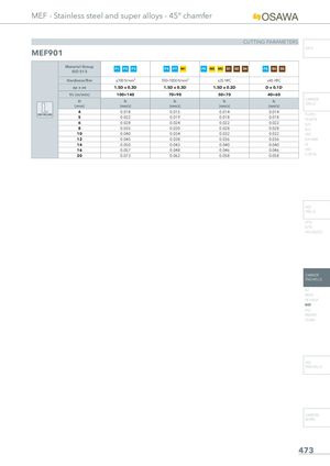MEF - Stainless steel and super alloys - 45° chamfer CUTTING PARAMETERS INFO MEF901 Material Group P1 P2 P3ISO 513 P4 P7 M1 P5 M2 M3 S1 S2 S4 P8 S3 S5 Hardness/Rm ≤700 N/mm² 700÷1000 N/mm² ≤35 HRC ≤45 HRC ap x ae 1.5D x 0.3D 1.5D x 0.3D 1.5D x 0.2D D x 0.1D Vc (m/min) 100÷140 70÷90 50÷70 40÷60 D fz(mm)(mm/z) fz(mm/z) fz(mm/z) fz(mm/z) CARBIDEDRILLS 4 0.018 0.015 0.014 0.014 SIDE MILLING 5 0.022 0.019 0.018 PU-HPU0.018TA-4HTA 6 0.028 0.024 0.022 0.022 SUH 8 0.035 0.030 0.028 0.028 ALH 10 0.040 0.034 0.032 0.032 HRC 12 0.045 0.038 0.036 0.036 SUH MINI 14 0.050 0.043 0.040 0.040 HL 16 0.057 0.048 0.046 0.046 HSD 20 0.073 0.062 0.058 0.058 C-SD-TA HSS DRILLS LFTA SUTA HSS-HSS/CO CARBIDE END-MILLS G2 MDTA HF VH/UP MEF ALU MEX/MH UH/MH HSS END-MILLS CARBIDE BURRS 473