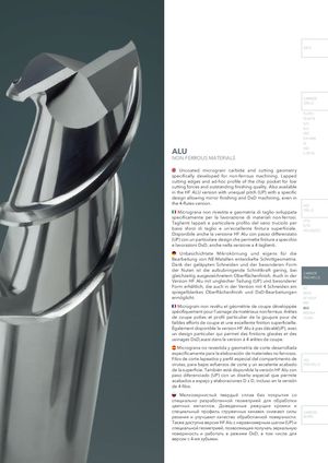 INFO CARBIDE DRILLS PU-HPU TA-4HTA SUH ALH HRC SUH MINI HL ALU HSDC-SD-TA NON-FERROUS MATERIALS Uncoated micrograin carbide and cutting geometry specifically developed for non-ferrous machining. Lapped cutting edges and ad-hoc profile of the chip pocket for low cutting forces and outstanding finishing quality. Also available in the HF ALU version with unequal pitch (UP) with a specific design allowing mirror finishing and DxD machining, even in the 4-flutes version. HSS Micrograna non rivestita e geometria di taglio sviluppata DRILLS specificamente per la lavorazione di materiali non-ferrosi. Taglienti lappati e particolare profilo del vano truciolo perbassisforziditaglioeun'eccellentefiniturasuperficiale.LFTASUTAHSS-HSS/CO Disponibile anche la versione HF Alu con passo differenziato (UP) con un particolare design che permette finiture a specchio e lavorazioni DxD, anche nella versione a 4 taglienti. Unbeschichtete Mikrokörnung und eigens für die Bearbeitung von NE-Metallen entwickelte Schnittgeometrie. Dank der geläppten Schneiden und der besonderen Form der Nuten ist die aufzubringende Schnittkraft gering, bei gleichzeitig ausgezeichnetem Oberflächenfinish. Auch in der CARBIDEEND-MILLS Version HF Alu mit ungleicher Teilung (UP) und besonderer Form erhältlich, die auch in der Version mit 4 Schneiden ein G2 spiegelblankes Oberflächenfinish und DxD-Bearbeitungen MDTA ermöglicht. HF VH/UP MEF Micrograin non revêtu et géométrie de coupe développée ALU spécifiquement pour l’usinage de matériaux non ferreux. Arêtes MEX/MH de coupe polies et profil particulier de la goujure pour de UH/MH faibles efforts de coupe et une excellente finition superficielle. Également disponible la version HF Alu à pas décalé(UP), avec un design particulier qui permet des finitions glacées et des usinages DxD,aussi dans la version à 4 arêtes de coupe. Micrograna no revestida y geometría de corte desarrollada específicamente para la elaboración de materiales no ferrosos. Filos de corte lapeados y perfil especial del compartimento de HSS virutas, para bajos esfuerzos de corte y un excelente acabado END-MILLS de la superfície. También está disponible la versión HF Alu con paso diferenciado (UP) con un diseño especial que permite acabados a espejo y elaboraciones D x D, incluso en la versión de 4 filos. Мелкозернистый твердый сплав без покрытия со специально разработанной геометрией для обработки цветных металлов. Доведенные режущие кромки и специальный профиль стружечных канавок снижают силы CARBIDE резания и улучшают качество обработанной поверхности. BURRS Также доступна версия HF Alu с неравномерным шагом (UP) и специальной геометрией, позволяющяя получать зеркальную поверхность и работать в режиме DxD, в том числе для версии с 4-мя зубьями.