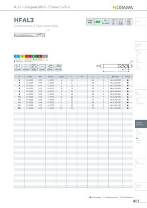 ALU - Unequal pitch - Corner radius HFAL3 OSAWANORM POLISHED INFO cylindrical shank, 3 flutes, corner radius CR CARBIDE DRILLS PU-HPU TA-4HTA P M K N S H SUH ALH H HRC H 1st choice I suitable CR SUH MINI HL HSD SLOTTING SIDE MILLING HELICAL RAMPING VERTICAL DRILLING C-SD-TA D D Tol. CR CR Tol. d(h6) l l1 L z EDP No. Stock 2 0/-0.030 0.10 +/-0.010 6 6.5 50 3 HFAL301020 h 3 0/-0.030 0.10 +/-0.010 6 9 50 3 HFAL301030 h 4 0/-0.030 0.10 +/-0.010 6 12 50 3 HFAL301040 h 5 0/-0.030 0.10 +/-0.010 6 15 50 3 HFAL301050 h 6 0/-0.030 0.10 +/-0.010 6 20 60 3 HFAL301060 h HSS 8 0/-0.030 0.10 +/-0.010 8 20 64 3 HFAL301080 h DRILLS 10 0/-0.030 0.10 +/-0.010 10 22 75 3 HFAL301100 h 12 0/-0.030 0.10 +/-0.010 12 25 75 3 HFAL301120 h LFTA 14 0/-0.030 0.10 +/-0.010 14 32 90 3 HFAL301140 h SUTAHSS-HSS/CO 16 0/-0.030 0.10 +/-0.010 16 32 90 3 HFAL301160 h 20 0/-0.030 0.10 +/-0.010 20 38 100 3 HFAL301200 h CARBIDE END-MILLS G2 MDTA HF VH/UP MEF ALU MEX/MH UH/MH HSS END-MILLS CARBIDE BURRS h stock standard f non-standard stock m stock exhaustion 481