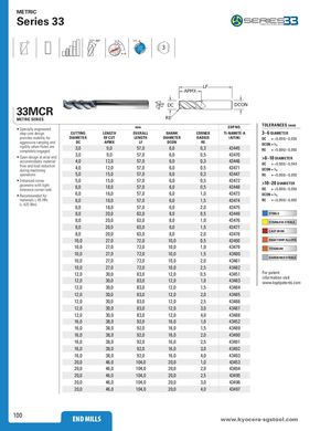 METRIC Series 33 32°–48° POS 3 ≠ LF APMX DC DCON 33MCR METRIC SERIES RE • Specially engineered mm EDP NO. TOLERANCES (mm) step core design CUTTING LENGTH OVERALL SHANK CORNER TI-NAMITE-A 3–6 DIAMETER provides stability for DIAMETER OF CUT LENGTH DIAMETER RADIUS (AlTiN) DC = +0,000/–0,030 aggressive ramping and DCrigidity when flutes arecompletely engaged3,0APMX LF DCON9,057,06,0 RE0,3 DCON = h643445RE= +0,000/–0,050 • Open design at axial end 3,0 9,0 57,0 6,0accommodates material4,012,057,06,0flow and load reductionduring machining4,012,057,06,00,50,34347043446>6–10 DIAMETERDC= +0,000/–0,0400,543471DCON = h6 operations 5,0 15,0 57,0 6,0 0,3 43447 RE = +0,000/–0,050 • Enhanced corner 5,0 15,0 57,0 6,0geometry with tighttolerance corner radii6,018,057,06,00,543472>10–20 DIAMETER0,543448DC= +0,000/–0,050 • Recommended for 6,0 18,0 57,0 6,0 1,0 43473 DCON = h6 materials ≤ 45 HRc 6,0 18,0 57,0 6,0 1,5 43474 RE = +0,000/–0,050 (≤ 420 Bhn) 6,0 18,0 57,0 6,0 2,0 43475 8,0 20,0 63,0 8,0 0,5 43449 STEELS 8,0 20,0 63,0 8,0 1,0 43476 STAINLESS STEELS 8,0 20,0 63,0 8,0 1,5 43477 CAST IRON 8,0 20,0 63,0 8,0 2,0 43478 10,0 27,0 72,0 10,0 0,5 43450 HIGH TEMP ALLOYS 10,0 27,0 72,0 10,0 1,0 43479 TITANIUM 10,0 27,0 72,0 10,0 1,5 43480 HARDENED STEELS 10,0 27,0 72,0 10,0 2,0 43481 10,0 27,0 72,0 10,0 2,5 43482 12,0 30,0 83,0 12,0 0,5 43451 For patent 12,0 30,0 83,0 12,0 1,0 43483 information visitwww.ksptpatents.com 12,0 30,0 83,0 12,0 1,5 43484 12,0 30,0 83,0 12,0 2,0 43485 12,0 30,0 83,0 12,0 2,5 43486 12,0 30,0 83,0 12,0 3,0 43487 12,0 30,0 83,0 12,0 4,0 43488 16,0 38,0 92,0 16,0 1,0 43452 16,0 38,0 92,0 16,0 1,5 43489 16,0 38,0 92,0 16,0 2,0 43490 16,0 38,0 92,0 16,0 2,5 43491 16,0 38,0 92,0 16,0 3,0 43492 16,0 38,0 92,0 16,0 4,0 43493 20,0 46,0 104,0 20,0 1,0 43453 20,0 46,0 104,0 20,0 2,0 43494 20,0 46,0 104,0 20,0 2,5 43495 20,0 46,0 104,0 20,0 3,0 43496 20,0 46,0 104,0 20,0 4,0 43497 100 END MILLS wwwE.kNyDoMceILraLS-sgstool.com