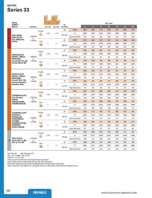 METRIC Series 33 Ap Series Ae Ae DC • mm 33MCR Vc Metric Hardness Ae x DC Ap x DC (m/min) 3 6 8 10 12 16 20 Profile 104 RPM 10987 5493 4120 3296 2747 2060 1648 ≤ 0.5 ≤ 1.5 Fz 0.007 0.019 0.034 0.043 0.050 0.067 0.072 CAST IRONSK(HIGH ALLOY)Gray, Malleable,Ductile≤ 260 Bhnor≤ 26 HRcSlot (83-124) Feed (mm/min) 237 316 422 422 415 411 35682RPM8725436232722617218116361309 1 ≤1 Fz 0.007 0.019 0.034 0.043 0.050 0.067 0.072 (66-99) Feed (mm/min) 188 251 335 335 330 327 283 Profile 24 RPM 2585 1293 969 776 646 485 388 SUPER ALLOYS ≤ 0.5 ≤ 1.5 Fz 0.006 0.017 0.028 0.035 0.041 0.054 0.059(20-29) (NICKEL, COBALT, ≤ 300 Bhn Feed (mm/min) 48 65 81 65 79 78 68 IRON BASE) or Inconel 601, 617, 625, ≤ 32 HRcIncoloy, Monel 400Slot1 20≤1 RPM 2100 1050 788 630 525 394 315Fz0.0060.0170.0280.0350.0410.0540.059 (16-24) Feed (mm/min) 39 53 66 66 64 64 55 Profile 19 RPM 2003 1002 751 601 501 376 301 SUPER ALLOYS ≤ 0.5 ≤ 1.5 Fz 0.005 0.012 0.019 0.024 0.029 0.038 0.043 (NICKEL, COBALT,IRON BASE)Inconel 718, X-750,Incoloy, Waspaloy,≤ 400 Bhnor≤ 43 HRcSlot(15-23)Feed (mm/min) 29 36 43 43 43 43 3815RPM1583792594475396297238 Hastelloy, Rene 1 ≤1 Fz 0.005 0.012 0.019 0.024 0.029 0.038 0.043 (12-18) Feed (mm/min) 23 28 34 34 34 34 30 S Profile 66 RPM 6947 3474 2605 2084 1737 1303 1042 TITANIUM ALLOYS ≤ 0.5 ≤ 1.5 Fz 0.007 0.019 0.032 0.040 0.048 0.064 0.069(52-79) Pure Titanium, ≤ 350 Bhn Feed (mm/min) 150 200 250 250 250 250 217 Ti6Al4V, or Ti6Al2Sn4Zr2Mo,Ti4Al4Mo2Sn0.5Si≤ 38 HRcSlot 1 52≤1 RPM 5493 2747 2060 1648 1373 1030 824Fz0.0070.0190.0320.0400.0480.0640.069 (41-62) Feed (mm/min) 119 158 198 198 198 198 171 TITANIUM ALLOYS Profile 23 RPM 2424 1212 909 727 606 454 364 (DIFFICULT) ≤ 0.5 ≤ 1.5 Fz 0.007 0.019 0.032 0.040 0.048 0.064 0.069 Ti10Al2Fe3Al,Ti5Al5V5Mo3Cr,Ti7Al4Mo,Ti3Al8V6Cr4Zr4Mo,≤ 440 Bhnor≤ 47 HRcSlot (18-27) Feed (mm/min) 52 70 87 87 87 87 7618RPM1939969727582485364291 Ti6Al6V6Sn, 1 ≤1 Fz 0.007 0.019 0.032 0.040 0.048 0.064 0.069 Ti15V3 Cr3Sn3Al (15-22) Feed (mm/min) 42 56 70 70 70 70 60 Profile 56 RPM 5978 2989 2242 1793 1495 1121 897 ≤ 0.5 ≤ 1.5 Fz 0.007 0.017 0.030 0.037 0.043 0.059 0.064 (45-68) TOOL STEELS ≤ 375 Bhn Feed (mm/min) 129 151 201 201 194 198 172 H A2, D2, H13, L2, M2, or P20, S7, T15, W2 ≤ 40 HRc Slot 44 RPM 4686 2343 1757 1406 1171 879 703 1 ≤1 Fz 0.007 0.017 0.030 0.037 0.043 0.059 0.064 (35-53) Feed (mm/min) 101 118 157 157 152 155 135 Bhn (Brinell) HRc (Rockwell C) rpm = (Vc x 1000) / (DC x 3.14) mm/min = Fz x 3 x rpm reduce speed and feed for materials harder than listed reduce feed and Ae when finish milling (.02 x DC maximum) feed rates listed have chip thinning adjustments included where applicable refer to the SGS Tool Wizard® for complete technical information (www.kyocera-sgstool.com) 102 END MILLS wwwE.kNyDoMceILraLS-sgstool.com