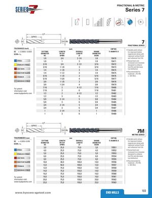 FRACTIONAL & METRIC Series 7 38° POS 4 ≠ LF APMX DC DCON 7 FRACTIONAL SERIES TOLERANCES (inch) inch EDP NO. • Variable pitch allows DC = +0.0000/–0.0020 CUTTING LENGTH OVERALL SHANK Ti-NAMITE-X for improved chatter DCON = h6 DIAMETER OF CUT LENGTH DIAMETERDCAPMXLFDCON suppression along withimproved surface finish 1/8 3/4 2-1/4 1/8 70470 and enhanced tool life STEELS 1/8 1 3 1/8 70471 • Raised land and STAINLESS STEELS 3/16 3/4 2-1/2 3/16 70472 increased core diameterdesigned to enhance 3/16 1-1/8 3 3/16 70473 tool life and decrease CAST IRON 1/4 1-1/8 3 1/4 70474 tool deflection HIGH TEMP ALLOYS 1/4 1-1/2 4 1/4 70475 • Recommended formaterials ≤ 45 HRc TITANIUM 5/16 1-1/8 3 5/16 70476 (≤ 420 Bhn) 5/16 1-5/8 4 5/16 70477 HARDENED STEELS 3/8 1-1/8 3 3/8 70478 3/8 1-3/4 4 3/8 70479 For patent 7/16 2 4-1/2 7/16 70480 information visit 7/16 3 6 7/16 70481 www.ksptpatents.com 1/2 2 4-1/2 1/2 70482 1/2 3 6 1/2 70483 5/8 2-1/4 5 5/8 70484 5/8 3 6 5/8 70485 3/4 2-1/4 5 3/4 70486 3/4 3 6 3/4 70487 1 2-1/4 5 1 70488 1 3 6 1 70489 LF APMX DC DCON 7M METRIC SERIES TOLERANCES (mm) mm EDP NO. • Variable pitch allows DC = +0,000/+0,050 CUTTING LENGTH OVERALL SHANK Ti-NAMITE-X for improved chatter DCON = h6 DIAMETER OF CUT LENGTH DIAMETERDCAPMXLFDCON suppression along withimproved surface finish 3,0 25,0 75,0 3,0 70551 and enhanced tool life STEELS 4,0 25,0 75,0 4,0 70552 • Raised land and STAINLESS STEELS 5,0 25,0 75,0 5,0 70553 increased core diameterdesigned to enhance 6,0 25,0 75,0 6,0 70554 tool life and decrease CAST IRON 8,0 25,0 75,0 8,0 70555 tool deflection HIGH TEMP ALLOYS 10,0 38,0 100,0 10,0 70556 • Recommended formaterials ≤ 45 HRc TITANIUM 12,0 50,0 100,0 12,0 70557 (≤ 420 Bhn) 12,0 75,0 150,0 12,0 70558 HARDENED STEELS 14,0 75,0 150,0 14,0 70559 16,0 75,0 150,0 16,0 70560 For patent 18,0 75,0 150,0 18,0 70561 information visit 20,0 75,0 150,0 20,0 70562 www.ksptpatents.com 25,0 75,0 150,0 25,0 70563 www.kyocerEaN-DsgMstILoLoSl.com END MILLS 103