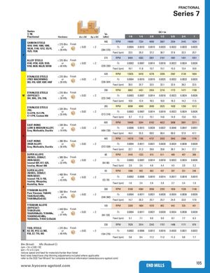 FRACTIONAL Series 7 Ap Series Ae Ae DC • in 7, 7B Vc Fractional Hardness Ae x DC Ap x DC (sfm) 1/8 1/4 3/8 1/2 5/8 3/4 1 CARBON STEELS1018, 1040, 1080, 1090,10L50, 1140, 1212, 12L15,1525, 1536≤ 275 BhnFinishor≤ 0.02≤ 28 HRc480RPM 14669 7334 4890 3667 2934 2445 1834≤2Fz0.00040.00100.00190.00250.00320.00330.0035(384-576)Feed (ipm)23.529.337.236.737.632.325.7 P 275 RPM 8404 4202 2801 2101 1681 1401 1051 ALLOY STEELS ≤ 375 Bhn Finish 4140, 4150, 4320, 5120, or ≤ 0.02 ≤2 Fz 0.0003 0.0007 0.0014 0.0018 0.0023 0.0024 0.0026 5150, 8630, 86L20, 50100 ≤ 40 HRc (220-330) Feed (ipm) 10.1 11.8 15.7 15.1 15.5 13.4 10.9 420 RPM 12835 6418 4278 3209 2567 2139 1604 STAINLESS STEELS ≤ 275 Bhn Finish (FREE MACHINING) or ≤ 0.02 ≤2 Fz 0.0004 0.0010 0.0019 0.0025 0.0032 0.0033 0.0035 303, 416, 420F, 430F, 440F ≤ 28 HRc (336-504) Feed (ipm) 20.5 25.7 32.5 32.1 32.9 28.2 22.5 290 RPM 8862 4431 2954 2216 1772 1477 1108 STAINLESS STEELS ≤ 275 Bhn Finish M (DIFFICULT) or ≤ 0.02 ≤2 Fz 0.0003 0.0007 0.0014 0.0018 0.0023 0.0024 0.0026 304, 304L, 316, 316L ≤ 28 HRc (232-348) Feed (ipm) 10.6 12.4 16.5 16.0 16.3 14.2 11.5 STAINLESS STEELS(PH)13-8 PH, 15-5 PH,17-4 PH, Custom 450 265 RPM 8098 4049 2699 2025 1620 1350 1012≤ 325 BhnFinishor≤ 0.02≤2Fz0.00030.00070.00140.00180.00230.00240.0026≤ 35 HRc(212-318)Feed (ipm)9.711.315.114.614.913.010.5 605 RPM 18489 9244 6163 4622 3698 3081 2311 CAST IRONS ≤ 220 Bhn Finish (LOW & MEDIUM ALLOY) or ≤ 0.02 ≤2 Fz 0.0006 0.0015 0.0028 0.0037 0.0046 0.0047 0.0051 Gray, Malleable, Ductile ≤ 19 HRc (484-726) Feed (ipm) 44.4 55.5 69.0 68.4 68.0 57.9 47.1 K 465 RPM 14210 7105 4737 3553 2842 2368 1776 CAST IRONS ≤ 260 Bhn Finish (HIGH ALLOY) or ≤ 0.02 ≤2 Fz 0.0004 0.0011 0.0021 0.0028 0.0034 0.0036 0.0039 Gray, Malleable, Ductile ≤ 26 HRc (372-558) Feed (ipm) 22.7 31.3 39.8 39.8 38.7 34.1 27.7 SUPER ALLOYS 80 RPM 2445 1222 815 611 489 407 306 (NICKEL, COBALT, ≤ 300 Bhn Finish IRON BASE) or ≤ 0.02 ≤2 Fz 0.0003 0.0007 0.0014 0.0018 0.0023 0.0024 0.0026 Inconel 601, 617, 625, ≤ 32 HRc (64-96) Incoloy, Monel 400 Feed (ipm) 2.9 3.4 4.6 4.4 4.5 3.9 3.2 SUPER ALLOYS 65 RPM 1986 993 662 497 397 331 248 (NICKEL, COBALT,IRON BASE)Inconel 718, X-750,Incoloy, Waspaloy,Hastelloy, Rene≤ 400 BhnFinishor≤ 0.02≤2Fz 0.0002 0.0006 0.0010 0.0014 0.0017 0.0018 0.0019≤ 43 HRc(52-78)Feed (ipm)1.62.42.62.82.72.41.9 S TITANIUM ALLOYSPure Titanium, Ti6Al4V,Ti6Al2Sn4Zr2Mo,Ti4Al4Mo2Sn0.5Si≤ 350 BhnFinishor≤ 0.02≤ 38 HRc300RPM 9168 4584 3056 2292 1834 1528 1146≤2Fz0.00040.00110.00210.00280.00340.00360.0039(240-360)Feed (ipm)14.720.225.725.724.922.017.9 TITANIUM ALLOYS 105 RPM 3209 1604 1070 802 642 535 401 (DIFFICULT)Ti10Al2Fe3Al,Ti5Al5V5Mo3Cr, Ti7Al4Mo,Ti3Al8V6Cr4Zr4Mo,≤ 440 BhnFinishor≤ 47 HRc≤ 0.02≤2(84-126)Fz 0.0004 0.0011 0.0021 0.0028 0.0034 0.0036 0.0039 Ti6Al6V6Sn, Ti15V3 Cr3Sn3Al Feed (ipm) 5.1 7.1 9.0 9.0 8.7 7.7 6.3 230 RPM 7029 3514 2343 1757 1406 1171 879 TOOL STEELS ≤ 375 Bhn Finish H A2, D2, H13, L2, M2, or ≤ 0.02 ≤2 Fz 0.0002 0.0006 0.0012 0.0016 0.0020 0.0021 0.0022 P20, S7, T15, W2 ≤ 40 HRc (184-276) Feed (ipm) 5.6 8.4 11.2 11.2 11.2 9.8 7.7 Bhn (Brinell) HRc (Rockwell C) rpm = Vc x 3.82 / DC ipm = Fz x 4 x rpm reduce speed and feed for materials harder than listed feed rates listed have chip thinning adjustments included where applicable refer to the SGS Tool Wizard® for complete technical information (www.kyocera-sgstool.com) www.kyocerEaN-DsgMstILoLoSl.com END MILLS 105