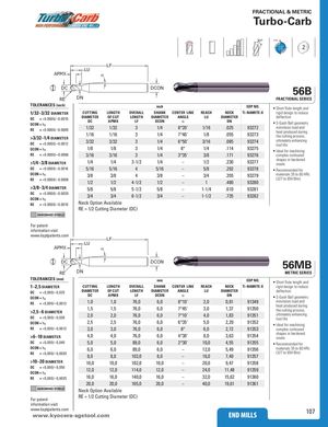 FRACTIONAL & METRIC Turbo-Carb 30° POS 2 LF LU APMX α DC DCON 56B RE DN FRACTIONAL SERIES TOLERANCES (inch) LF inch EDP NO. • Short flute length and 1/32–3/32 DIAMETER CLUUTTING LENGTH OVERALL SHANK CENTER LINE REACH NECK Ti-NAMITE-X rigid design to reduce DC = +0.0000A/–P0M.00X10 DIAMETER OF CUT LENGTH DIAMETER ANGLEDCAPMXLFDCONαDCON = h6RE= +0.0000/–0.0D0C051/321/323DCO1/N48°20'>3/32–1/4 DIAMETER1/161/1631/47°40'DC= +0.0000/–0R.0E012DN3/323/3231/46°50'LUDIAMETERDN1/16.025932721/8.055932733/16.08593274deflection• S-Gash Ball geometryminimizes load andheat produced duringthe cutting process,ultimately enhancingtool life DCON = h6 1/8 1/8 3 1/4 6° 1/4 .114 93275 • Ideal for machining RE = +0.0000/–0.0006 3/16 3/16 3 1/4 3°35' 3/8 .171 93276 complex contoured >1/4–3/8 DIAMETER 1/4 1/4 3-1/2 1/4 – 1/2 .230 93277 shapes in hardenedsteels DC = +0.0000/–0.0016 5/16 5/16 4 5/16 – 5/8 .292 93278 • Recommended for DCON = h6 3/8 3/8 4 3/8 – 3/4 .355 93279 materials 35 to 60 HRc RE = +0.0000/–0.0008 1/2 1/2 4-1/2 1/2 – (327 to 654 Bhn)1.48093280 >3/8–3/4 DIAMETER 5/8 5/8 5-1/2 5/8 – 1-1/4 .610 93281 DC = +0.0000/–0.0020 3/4 3/4 6-1/2 3/4 – 1-1/2 .735 93282 DCON = h6 RE = +0.0000/–0.0010 Neck Option Available RE = 1/2 Cutting Diameter (DC) HARDENED STEELS For patent information visit www.ksptpatents.com LF LU APMX α DC DCON 56MB RE DN METRIC SERIES TOLERANCES (mm) LF mm EDP NO. • Short flute length and 1–2,5 DIAMETER CLUUTTING LENGTH OVERALL SHANK CENTER LINE REACH NECK Ti-NAMITE-X rigid design to reduce DC = +0,000/A–0P,0M25X DIAMETER OF CUT LENGTH DIAMETER ANGLEDCAPMXLFDCONαDCON = h6RE= +0,000/–0,0D01C31,01,076,0DCO6,0N8°10'>2,5–6 DIAMETER1,51,576,06,07°45'DC= +0,000/–0,0R3E0DN2,02,076,06,07°10'LUDIAMETERDN2,00,91913493,01,37913504,01,8391351deflection• S-Gash Ball geometryminimizes load andheat produced duringthe cutting process,ultimately enhancingtool life DCON = h6 2,5 2,5 76,0 6,0 6°35' 5,0 2,29 91352 • Ideal for machining RE = +0,000/–0,0013 3,0 3,0 76,0 6,0 6° 6,0 2,72 91353 complex contoured >6–10 DIAMETER 4,0 4,0 76,0 6,0 4°30' 8,0 3,63 91354 shapes in hardenedsteels DC = +0,000/–0,040 5,0 5,0 89,0 6,0 2°30' 10,0 4,55 91355 • Recommended for DCON = h6 6,0 6,0 89,0 6,0 – 12,0 5,49 91356 materials 35 to 60 HRc RE = +0,000/–0,0020 (327 to 654 Bhn)8,08,0102,08,0–16,07,4991357 >10–20 DIAMETER 10,0 10,0 102,0 10,0 – 20,0 9,47 91358 DC = +0,000/–0,050 12,0 12,0 114,0 12,0 – 24,0 11,48 91359 DCON = h6 RE = +0,000/–0,0025 16,0 16,0 140,0 16,0 – 32,0 15,62 91360 20,0 20,0 165,0 20,0 – 40,0 19,61 91361 HARDENED STEELS Neck Option Available For patent RE = 1/2 Cutting Diameter (DC) information visit www.ksptpatents.comwww.kyocerEaN-DsgMstILoLoSl.com END MILLS 107