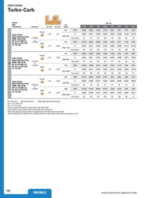 FRACTIONAL Turbo-Carb Ap Series Ae Ae DC • in 56B Vc Fractional Hardness Ae x DC Ap x DC (sfm) 1/32 1/16 1/8 3/16 1/4 3/8 1/2 3/4 625 RPM 76400 38200 19100 12733 9550 6367 4775 3183 Rough TOOL STEELS ≤ 0.4MOLD AND DIE STEEL300M, 4340, 52100,HP-9-4-20, M50, A2,D2, H13, L2, M2, P20,S7, T15, W2≤ 375 Bhnor≤ 40 HRcHSM≤ 0.4≤ 0.1Fz0.00060.00150.00300.00400.00500.00800.01000.0120(500-750)Feed (ipm)92115115102961029676950RPM11612858064290321935514516967772584839≤ 0.03Fz0.00070.00170.00330.00440.00600.00880.01100.0130 (760-1140) Feed (ipm) 163 197 192 170 174 170 160 126 750 RPM 91680 45840 22920 15280 11460 7640 5730 3820 Rough TOOL STEELS ≤ 0.4HMOLD AND DIE STEEL300M, 4340, 52100,HP-9-4-20, M50, A2,D2, H13, L2, M2, P20,S7, T15, W2≤ 475 Bhnor≤ 50 HRcHSM≤ 0.4≤ 0.05Fz0.00050.00110.00230.00300.00380.00600.00750.0085(600-900)Feed (ipm)9210110592879286651150RPM140576702883514423429175721171587865857≤ 0.02Fz0.00060.00120.00250.00330.00420.00660.00820.0100 (920-1380) Feed (ipm) 169 169 176 155 148 155 144 117 500 RPM 61120 30560 15280 10187 7640 5093 3820 2547 Rough TOOL STEELS ≤ 0.4MOLD AND DIE STEEL300M, 4340, 52100,HP-9-4-20, M50, A2,D2, H13, L2, M2, P20,≤ 655 Bhnor≤ 60 HRcHSM≤ 0.04Fz0.00040.00080.00170.00230.00290.00450.00570.0063(400-600)Feed (ipm)49495247444644321000RPM122240611203056020373152801018776405093 S7, T15, W2 ≤ 0.4 ≤ 0.01 Fz 0.0005 0.0009 0.0019 0.0025 0.0032 0.0050 0.0063 0.0071 (800-1200) Feed (ipm) 122 110 116 102 98 102 96 72 Bhn (Brinell) HRc (Rockwell C) HSM (High Speed Machining) rpm = Vc x 3.82 / DC ipm = Fz x 2 x rpm reduce speed and feed for materials harder than listed reduce feed and Ae when finish milling (.02 x DC maximum) feed rates listed have chip thinning adjustments included where applicable refer to the SGS Tool Wizard® for complete technical information (www.kyocera-sgstool.com) 108 END MILLS wwwE.kNyDoMceILraLS-sgstool.com