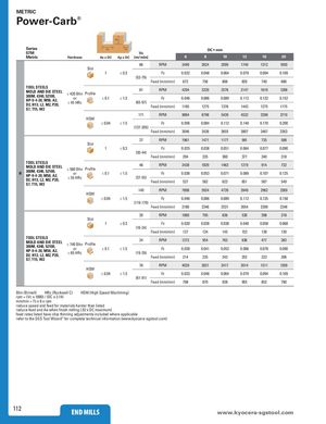METRIC Power-Carb® Ap Series Ae Ae DC • mm 57M Vc Metric Hardness Ae x DC Ap x DC (m/min) 6 8 10 12 16 20 66 RPM 3499 2624 2099 1749 1312 1050 Slot 1 ≤ 0.3 Fz 0.032 0.048 0.064 0.079 0.094 0.109 (53-79) Feed (mm/min) 672 756 806 829 740 686 TOOL STEELSMOLD AND DIE STEEL300M, 4340, 52100,HP-9-4-20, M50, A2,D2, H13, L2, M2, P20,≤ 420 BhnProfileor≤ 45 HRc≤ 0.1S7, T15, W281RPM4294≤ 1.5Fz0.046(65-97)Feed (mm/min)118532200.066127525760.089137621470.112144316100.132127512880.1521175 171 RPM 9064 6798 5439 4532 3399 2719 HSM ≤ 0.04 ≤ 1.5 Fz 0.056 0.084 0.112 0.140 0.170 0.200 (137-205) Feed (mm/min) 3046 3426 3655 3807 3467 3263 37 RPM 1961 1471 1177 981 735 588 Slot 1 ≤ 0.3 Fz 0.025 0.038 0.051 0.064 0.077 0.090 (30-44) Feed (mm/min) 294 335 360 377 340 318 TOOL STEELSHMOLD AND DIE STEEL300M, 4340, 52100,HP-9-4-20, M50, A2,D2, H13, L2, M2, P20,≤ 560 BhnProfileor≤ 55 HRc≤ 0.1S7, T15, W246RPM2438≤ 1.5Fz0.036(37-55)Feed (mm/min)52718290.05358214630.07162312190.0896519140.1075877320.125549 149 RPM 7898 5924 4739 3949 2962 2369 HSM ≤ 0.04 ≤ 1.5 Fz 0.046 0.066 0.089 0.112 0.135 0.158 (119-179) Feed (mm/min) 2180 2346 2531 2654 2399 2246 20 RPM 1060 795 636 530 398 318 Slot 1 ≤ 0.3 Fz 0.020 0.028 0.038 0.048 0.058 0.068 (16-24) Feed (mm/min) 127 134 145 153 138 130 TOOL STEELSMOLD AND DIE STEEL300M, 4340, 52100,HP-9-4-20, M50, A2,D2, H13, L2, M2, P20,≤ 740 BhnProfileor≤ 65 HRc≤ 0.1S7, T15, W224RPM1272≤ 1.5Fz0.028(19-29)Feed (mm/min)2149540.0412357630.0532436360.0662524770.0782233820.090206 76 RPM 4029 3021 2417 2014 1511 1209 HSM ≤ 0.04 ≤ 1.5 Fz 0.033 0.048 0.064 0.079 0.094 0.109 (61-91) Feed (mm/min) 798 870 928 955 852 790 Bhn (Brinell) HRc (Rockwell C) HSM (High Speed Machining) rpm = (Vc x 1000) / (DC x 3.14) mm/min = Fz x 6 x rpm reduce speed and feed for materials harder than listed reduce feed and Ae when finish milling (.02 x DC maximum) feed rates listed have chip thinning adjustments included where applicable refer to the SGS Tool Wizard® for complete technical information (www.kyocera-sgstool.com) 112 END MILLS wwwE.kNyDoMceILraLS-sgstool.com