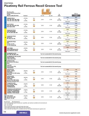 FRACTIONAL Picatinny Rail Ferrous Recoil Groove Tool Ap Picatinny Rail Ferrous Recoil Groove Tool Ae Ae DC • in 3 Flute Vc Made to MIL-STD-1913 Hardness Ae x DC Ap x DC (sfm) 0.2100 CARBON STEELS ≤ 275 Bhn Slot1018, 1040, 1080, 1090, 10L50,or1140, 1212, 12L15, 1525, 1536≤ 28 HRc0.210 RPM 80040.118440(352-528)Fz0.0009Feed (ipm)22.99 P ALLOY STEELS ≤ 375 Bhn Slot4140, 4150, 4320, 5120, 5150,or8630, 86L20, 50100≤ 40 HRc0.210 RPM 45480.118250(200-300)Fz0.0006 Feed (ipm) 9.79 STAINLESS STEELS ≤ 275 Bhn Slot(FREE MACHINING)or303, 416, 420F, 430F, 440F≤ 28 HRc0.210 RPM 70940.118390(312-468)Fz0.0007Feed (ipm)17.01 STAINLESS STEELSM(DIFFICULT)304, 304L, 316, 316L≤ 275 BhnSlotor≤ 28 HRc 0.210 RPM 49110.118270(216-324)Fz0.0006 Feed (ipm) 9.41 STAINLESS STEELS(PH)13-8 PH, 15-5 PH,17-4 PH, Custom 450≤ 325 BhnSlotor≤ 35 HRc0.210 RPM 45480.118250(200-300)Fz0.0006Feed (ipm)8.74 CAST IRONS ≤ 220 Bhn SlotK(LOW & MEDIUM ALLOY)orGray, Malleable, Ductile≤ 19 HRc0.210 RPM 49110.118270(216-324)Fz0.0006 Feed (ipm) 9.41 ALUMINUM ALLOYS2017, 2024, 356, 6061, 7075 Tool not recommended for this material group ALUMINUM DIE CAST ALLOYS (HIGH SILICONE) Tool not recommended for this material group A-390, A-392, B-390 N COPPER ALLOYS Alum Bronze, C110, Muntz Tool not recommended for this material group Brass PLASTICS Polycarbonate, PVC, Tool not recommended for this material group Polypropylene SUPER ALLOYS RPM 1182 (NICKEL, COBALT, ≤ 300 Bhn SlotIRON BASE)orInconel 601, 617, 625, Incoloy,≤ 32 HRc0.2100.118 65(52-78) Fz 0.0005 Monel 400 Feed (ipm) 2.00 SUPER ALLOYS RPM 891 (NICKEL, COBALT, ≤ 400 Bhn SlotIRON BASE)orInconel 718, X-750, Incoloy,≤ 43 HRc0.210 0.118 49(39-59) Fz 0.0004 S Waspaloy, Hastelloy, Rene Feed (ipm) 1.05 TITANIUM ALLOYSPure Titanium, Ti6Al4V,Ti6Al2Sn4Zr2Mo,Ti4Al4Mo2Sn0.5Si≤ 350 BhnSlotor≤ 38 HRc0.210 RPM 30920.118170(136-204)Fz0.0006Feed (ipm)5.89 TITANIUM ALLOYS (DIFFICULT)Ti10Al2Fe3Al, Ti5Al5V5Mo3Cr,Ti7Al4Mo, Ti3Al8V6Cr4Zr4Mo,Ti6Al6V6Sn, Ti15V3 Cr3Sn3Al≤ 440 Bhnor≤ 47 HRcSlot0.210 RPM 10910.11860(48-72)Fz0.0006Feed (ipm)2.09 TOOL STEELSHA2, D2, H13, L2, M2,P20, S7, T15, W2≤ 375 BhnSlotor≤ 40 HRc 0.210 RPM 26380.118145(116-174)Fz0.0005 Feed (ipm) 4.47 Bhn (Brinell) HRc (Rockwell C) when recommended speed exceeds your capability, use maximum available and recalculate ipm rpm = Vc x 3.82 / DC ipm = Fz x 3 x rpm reduce speed and feed for materials harder than listed reduce feed and Ae when finish milling (.02 x DC maximum) refer to the SGS Tool Wizard® for complete technical information (www.kyocera-sgstool.com) 118 END MILLS wwwE.kNyDoMceILraLS-sgstool.com
