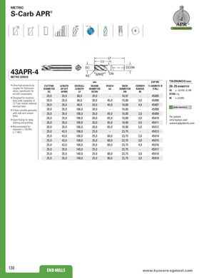 METRIC S-Carb APR® 38° POS ADVANCED PRODUCTIVITY ROUGHER ADVANCED PRODUCTIVITY ROUGHER 4 LF LU DC DCON 43APR-4METRIC SERIES RE APMX DN mm EDP NO. TOLERANCES (mm) • Ultra high-productivityrougher for Aluminumalloys, specifically forCUTTINGLENGTHOVERALL SHANK REACH NECK CORNER Ti-NAMITE-B 20–25 DIAMETERDIAMETEROF CUTLENGTHDIAMETERLUDIAMETERRADIUS(TiB2)DCAPMXLFDCONDNREDC= –0,010/–0,100 aircraft components• Designed for machine20,035,0 86,0 20,0 – 18,97 – 45005 DCON = h6RE= ±0,050 tools with capability of 20,0 35,0 86,0 20,0 45,0 19,00 3,0 45006 12 l³ per minute materialremoval rates20,0 35,0 86,0 20,0 45,0 19,00 4,0 45007• 4 flute variable geometry20,035,0106,020,0–19,00–45008 NON-FERROUS with side exit coolant 20,0 35,0 106,0 20,0 65,0 19,00 2,0 45009 holes• Open fluting for deep 20,0 35,0 106,0 20,0 65,0 19,00 3,0 45010 For patentinformation visit slotting and profiling 20,0 35,0 106,0 20,0 65,0 19,00 4,0 45011 www.ksptpatents.com • Recommended for 20,0 35,0 106,0 20,0 65,0 19,00 5,0 45012 materials ≤ 150 Bhn (≤ 7 HRc) 25,0 43,0 108,0 25,0 – 23,75 – 45013 25,0 43,0 108,0 25,0 60,0 23,75 2,0 45014 25,0 43,0 108,0 25,0 60,0 23,75 3,0 45015 25,0 43,0 108,0 25,0 60,0 23,75 4,0 45016 25,0 35,0 140,0 25,0 – 23,75 – 45017 25,0 35,0 140,0 25,0 80,0 23,75 3,0 45018 25,0 35,0 140,0 25,0 90,0 23,75 3,0 45019 130 END MILLS wwwE.kNyDoMceILraLS-sgstool.com