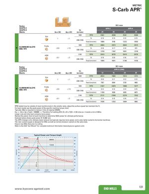 METRIC S-Carb APR® Ap Series Ae Ae DC • mm 43APR-3 APR-3 APR-4 43APR-4 Vc Metric Ae x DC Ap x DC (m/min) 20 25 20 25 1600 RPM 25461 20369 25461 20369 Slot 1 ≤1 Fz 0.14 0.15 0.12 0.13 (300-2100) Feed (mm/min) 10694 9166 12222 10592 N ALUMINIUM ALLOYS6068, 7075 Profile 1800 RPM 28644 22915 28644 22915≤ 0.5≤ 1.5Fz0.160.170.14015(300-2100) Feed (mm/min) 13749 11687 16041 13749 HSM 2100 RPM 33418 26735 33418 26735 ≤ 0.1 ≤2 Fz 0.19 0.20 0.16 0.17 (300-2100) Feed (mm/min) 19048 16041 21388 18180 Series DC • mm 43APR-3 APR-3 LONG 43APR-4 Vc Metric Ae x DC Ap x DC (m/min) 12 16 20 25 1600 RPM 26522 19892 15913 12731 Slot 1 ≤1 Fz 0.10 0.11 0.12 0.13 (300-2100) Feed (mm/min) 7957 6564 5729 4965 N ALUMINIUM ALLOYS6068, 7075 Profile 1800 RPM 31827 23870 19096 15277≤ 0.5≤ 1.5Fz0.120.130.140.15(300-2100) Feed (mm/min) 11458 9309 8020 6875 HSM 2100 RPM 37131 27849 22279 17823 ≤ 0.1 ≤2 Fz 0.14 0.15 0.16 0.17 (300-2100) Feed (mm/min) 15595 12532 10694 9090 RPM stated may be outside of most machine tools in the smaller sizes, adjust the surface speed but maintain the Fz For best results use the peak power of the specific machine torque chart. Typically 10kw is required to remove 1 litre of material (MMR). Eg. >> (Ae x Ap x Feed) / 1000000 >> Therefore Full slotting Ø25: 25 x 25 x 7333 = 4.58 Litres so it needs a min of 46Kw. Larger cuts and chip load consume more power. Review the power chart of each machine to determine MAX power for ultimate performance. Example below shows peak power @ 10,000 rpm. The APR-4 design is for ultimate metal removal but typicaly requires more power, and is also better suited to horizontal machines. The new coolant supply is designed for MQL as well as normal emulsion coolant on the same data. Ensure max MQL flow prior to cutting. Refer to the SGS Tool Wizard® for complete technical information (www.kyocera-sgstool.com). www.kyocerEaN-DsgMstILoLoSl.com END MILLS 131 10000 rpm