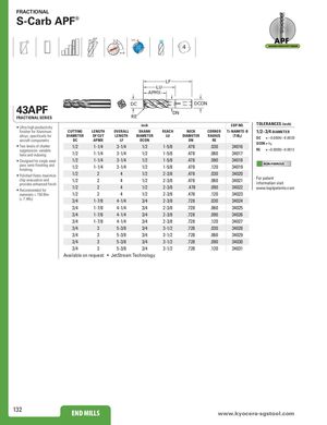 FRACTIONAL S-Carb APF® 41° POS 38° 4 ADVANCED PRODUCTIVITY FINISHER ≠ LF LU APMX DC DCON 43APF DN FRACTIONAL SERIES RE • Ultra high-productivity inch EDP NO. TOLERANCES (inch) finisher for Aluminum CUTTING LENGTH OVERALL SHANK REACH NECK CORNER Ti-NAMITE-B 1/2–3/4 DIAMETER alloys, specifically foraircraft componentsDIAMETEROF CUT LENGTH DIAMETER LU DIAMETER RADIUS (TiB2)DCAPMXLFDCONDNREDC= –0.0004/–0.0020 • Two levels of chatter 1/2 1-1/4 3-1/4 1/2 1-5/8 .478 .030 34016 DCON = h6 suppression: variablehelix and indexing RE = +0.0000/–0.00121/21-1/43-1/41/21-5/8.478.06034017 • Designed for single axial 1/2 1-1/4 3-1/4 1/2 1-5/8 .478 .090 34018 pass semi-finishing andfinishing 1/2 1-1/4 3-1/4 1/2 1-5/8 .478 .120 34019 NON-FERROUS • Polished flutes maximize 1/2 2chip evacuation and1/22provides enhanced finish• Recommended for1/2241/22-3/8.478.030 3402041/22-3/8.478.06034021For patentinformation visit41/22-3/8.478.09034022www.ksptpatents.com materials ≤ 150 Bhn 1/2 2 4 1/2 2-3/8 .478 .120 34023 (≤ 7 HRc) 3/4 1-7/8 4-1/4 3/4 2-3/8 .728 .030 34024 3/4 1-7/8 4-1/4 3/4 2-3/8 .728 .060 34025 3/4 1-7/8 4-1/4 3/4 2-3/8 .728 .090 34026 3/4 1-7/8 4-1/4 3/4 2-3/8 .728 .120 34027 3/4 3 5-3/8 3/4 3-1/2 .728 .030 34028 3/4 3 5-3/8 3/4 3-1/2 .728 .060 34029 3/4 3 5-3/8 3/4 3-1/2 .728 .090 34030 3/4 3 5-3/8 3/4 3-1/2 .728 .120 34031 Available on request: • JetStream Technology 132 END MILLS wwwE.kNyDoMceILraLS-sgstool.com