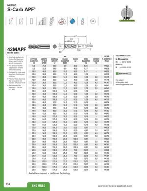 METRIC S-Carb APF® 41° POS 38° 4 ADVANCED PRODUCTIVITY FINISHER ≠ LF LU APMX DC DCON 43MAPF DN METRIC SERIES RE • Ultra high-productivity mm EDP NO. TOLERANCES (mm) finisher for Aluminum CUTTING LENGTH OVERALL SHANK REACH NECK CORNER Ti-NAMITE-B 6–25 DIAMETER alloys, specifically foraircraft componentsDIAMETEROF CUT LENGTH DIAMETER LU DIAMETER RADIUS (TiB2)DCAPMXLFDCONDNREDC= –0,010/–0,050 • Two levels of chatter 6,0 24,0 58,0 6,0 30,0 5,66 – 44627 DCON = h6 suppression: variablehelix and indexing8,0 32,0 64,0 8,0 40,0 7,57 – 44628 RE = +0,000/–0,030 • Designed for single axial 10,0 40,0 80,0 10,0 50,0 9,47 – 44629 pass semi-finishing and 12,0 30,0 83,0 12,0 40,0 11,38 – 44630 NON-FERROUS finishing 12,0 30,0 83,0 12,0 40,0 11,38 2,0 44745 • Polished flutes maximizechip evacuation and12,030,0 83,0 12,0 40,0 11,38 3,0 44746 For patent provides enhanced finish 12,0 30,0 83,0 12,0 40,0 11,38 4,0 44747 information visit • Recommended for 12,0 30,0 83,0 12,0 50,0 11,38 0,5 44641 www.ksptpatents.com materials ≤ 150 Bhn(≤ 7 HRc) 12,0 30,0 83,0 12,0 50,0 11,38 5,0 44642 12,0 48,0 100,0 12,0 62,0 11,38 – 44631 12,0 48,0 100,0 12,0 62,0 11,38 2,0 44748 12,0 48,0 100,0 12,0 62,0 11,38 3,0 44749 12,0 48,0 100,0 12,0 62,0 11,38 4,0 44750 16,0 40,0 92,0 16,0 51,0 15,16 – 44634 16,0 40,0 92,0 16,0 51,0 15,16 2,0 44751 16,0 40,0 92,0 16,0 51,0 15,16 3,0 44752 16,0 40,0 92,0 16,0 51,0 15,16 4,0 44753 16,0 42,0 93,0 16,0 51,0 15,16 5,0 44643 16,0 64,0 125,0 16,0 82,0 15,16 – 44635 16,0 64,0 125,0 16,0 82,0 15,16 2,0 44754 16,0 64,0 125,0 16,0 82,0 15,16 3,0 44755 16,0 64,0 125,0 16,0 82,0 15,16 4,0 44756 20,0 50,0 108,0 20,0 63,0 18,97 – 44636 20,0 50,0 108,0 20,0 63,0 18,97 3,0 44757 20,0 50,0 108,0 20,0 63,0 18,97 4,0 44758 20,0 50,0 108,0 20,0 63,0 18,97 5,0 44759 20,0 80,0 150,0 20,0 102,0 18,97 – 44637 20,0 80,0 150,0 20,0 102,0 18,97 3,0 44760 20,0 80,0 150,0 20,0 102,0 18,97 4,0 44761 20,0 80,0 150,0 20,0 102,0 18,97 5,0 44762 25,0 63,0 130,0 25,0 79,0 23,75 – 44638 25,0 63,0 130,0 25,0 79,0 23,75 3,0 44763 25,0 63,0 130,0 25,0 79,0 23,75 4,0 44764 25,0 63,0 130,0 25,0 79,0 23,75 5,0 44765 25,0 100,0 175,0 25,0 120,0 23,75 – 44639 25,0 100,0 175,0 25,0 120,0 23,75 3,0 44766 25,0 100,0 175,0 25,0 120,0 23,75 4,0 44767 25,0 100,0 175,0 25,0 120,0 23,75 5,0 44768 Available on request: • JetStream Technology 134 END MILLS wwwE.kNyDoMceILraLS-sgstool.com
