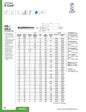 FRACTIONAL S-Carb® 38° POS ® 3 LF 43L • LU 43LC DC DCONDN FRACTIONAL SERIES RE APMX • Circular land allows inch EDP NO. TOLERANCES (inch) for increased controlat various speed andCUTTINGLENGTHOVERALL SHANK REACH NECK CORNER UNCOATED Ti-NAMITE-BDIAMETEROF CUTLENGTHDIAMETERLUDIAMETERRADIUS(TiB2)1/8–3/16 DIAMETER feed rates and reduces DC APMX LF DCON DN RE DC = +0.0000/–0.00032 chatter 1/8 5/32 3 1/8 1/2 .105 – 32700 32725 DCON = h6 • Symmetrical end gashingfor excellent balance1/85/32 3 1/8 1/2 .105 .010 32751 32815 RE = +0.0000/–0.0020 at high speeds and 1/8 5/32 3 1/8 3/4 .105 – 32691 34888 1/4–3/8 DIAMETER aggressive plungingcapability 3/16 7/32 3 3/16 1/2 .105 – 32701 32726 DC = +0.0000/–0.00035DCON = h6 • Open fluting for deep 3/16 7/32 3 3/16 1/2 .167 .010 32752 32816 RE = +0.0000/–0.0020 slotting and profiling• Necked design withblended diameter3/167/323 3/16 3/4 .167 – 32692 34889 1/2–5/8 DIAMETER1/43/82-1/21/43/4.230.0153578736235DC= +0.0000/–0.00043 transitions provideclearance to reach• Enhanced corner1/43/82-1/2 1/4 3/4 .230 .060 35788 36236 DCON = h61/43/841/43/4.230–3270232727RE= +0.0000/–0.0020 geometry with tight 1/4 3/8 4 1/4 3/4 .230 .010 32753 32817 3/4–1 DIAMETER tolerance corner radii 1/4 3/8 4 1/4 3/4 .230 .030 32754 32818 DC = +0.0000/–0.00051 • Recommended formaterials ≤ 150 Bhn(≤ 7 HRc)1/43/8 4 1/4 1-1/2 .230 – 32703 32728 DCON = h6RE= +0.0000/–0.00201/43/841/41-1/2.230.0103275532819 1/4 3/8 4 1/4 1-1/2 .230 .030 32756 32820 NON-FERROUS 1/4 3/8 4 1/4 2-1/8 .230 – 32704 32729 1/4 3/8 4 1/4 2-1/8 .230 .010 32757 32821 PLASTICS/COMPOSITES 1/4 3/8 4 1/4 2-1/8 .230 .030 32758 32822 5/16 7/16 4 5/16 1-1/8 .292 – 32705 32730 For patent information visit 5/16 7/16 4 5/16 1-1/8 .292 .030 32759 32823 www.ksptpatents.com 5/16 7/16 4 5/16 2-1/8 .292 – 32706 32731 5/16 7/16 4 5/16 2-1/8 .292 .030 32760 32824 3/8 1/2 3 3/8 1-1/8 .355 .015 35791 36239 3/8 1/2 3 3/8 1-1/8 .355 .090 35792 36240 3/8 1/2 4 3/8 1-1/8 .355 – 32707 32732 3/8 1/2 4 3/8 1-1/8 .355 .030 32762 32826 3/8 1/2 4 3/8 1-1/8 .355 .060 32763 32827 3/8 1/2 4 3/8 2-1/8 .355 – 32708 32733 3/8 1/2 4 3/8 2-1/8 .355 .030 32764 32828 3/8 1/2 4 3/8 2-1/8 .355 .060 32765 32829 1/2 5/8 3 1/2 1-3/8 .480 .015 35795 36243 1/2 5/8 4 1/2 1-3/8 .480 – 32709 32734 1/2 5/8 4 1/2 1-3/8 .480 .030 32767 32831 1/2 5/8 4 1/2 1-3/8 .480 .060 32768 32832 1/2 5/8 4 1/2 1-3/8 .480 .090 32769 32833 1/2 5/8 4 1/2 1-3/8 .480 .120 32770 32834 1/2 5/8 4 1/2 2-1/4 .480 .015 35796 36244 continued on next page 140 END MILLS wwwE.kNyDoMceILraLS-sgstool.com